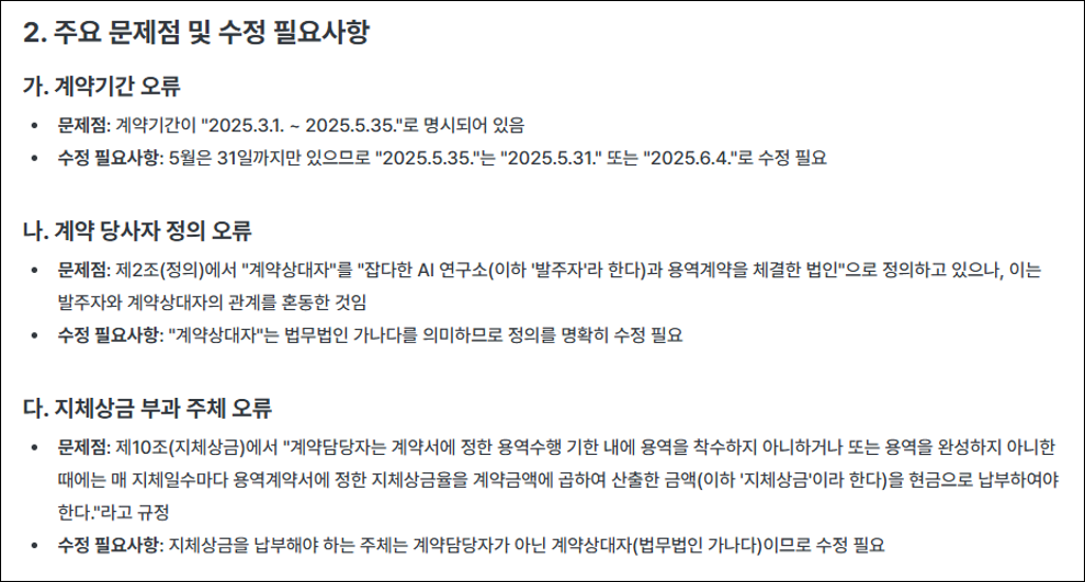 우선, 눈에 띄는 날짜 오류를 정확히 짚어냈습니다. 계약 기간을 '5월 35일'로 적었는데, 이를 찾아냈습니다. 또한 계약서상 '계약상대자'로 적혀 이중적으로 해석될 수 있는 부분을 '법무법인 가나다'로 명시해야 한다고 조언하는 등, 사소한 부분까지 꽤나 세심하게 챙기는 모습이었습니다. 기본적인 형식 오류나 오타를 잡아내는 단순 문장 검토를 넘어서서, AI가 자체적으로 문서를 해석하는 능력도 잘 갖추고 있기 때문이겠죠.