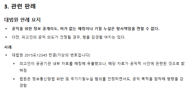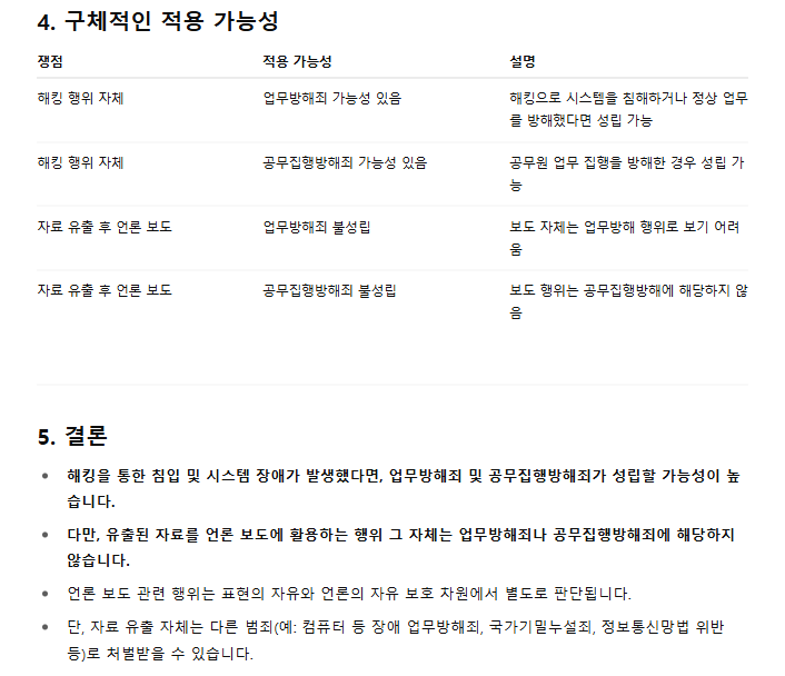이번엔 내란죄 대신 공무집행방해죄에 대해 물어보기로 했습니다. "해킹을 통해 특정 정부 기관 자료를 유출해, 언론 보도에 활용한 경우 업무방해 또는 공무집행방해죄가 성립할까?"라고 질문했습니다. 두 혐의 각각의 개념과 판단의 기준이 되는 핵심 요소들을 하나하나 따져가며 결론을 내렸습니다.