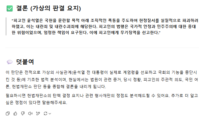 분석을 넘어서서, 이번엔 윤 전 대통령의 내란 혐의에 대해 아예 판결을 내려달라고 주문했습니다. 법적 판단과 양형 판단을 거쳐서 가상의 판결문 결론 부분을 작성해 줬습니다. 챗GPT는 내란죄가 성립한다면서 무기징역을 선고했습니다. 하지만 상당히 신중한 태도를 보였는데요, "이 판단은 전적으로 가상의 사실관계에 기초했다"면서 "현실에서는 법원이 당시 정황과 국민 여론, 헌법재판소 판단을 종합해 결론을 내린다"라고 당부했어요.