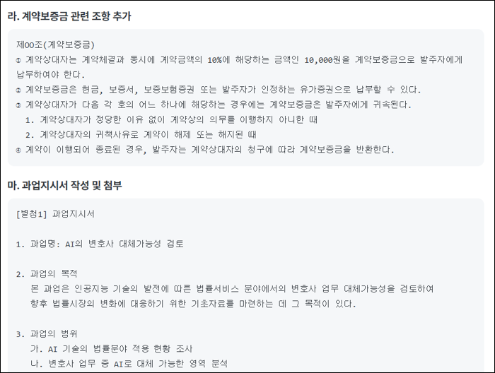 일부 누락된 조항이나, 계약서 자체를 보완하기 위한 방안들도 전반적으로 잘 제시하고 있었습니다. 예컨대 연구용역의 결과물에 대한 지식재산권 귀속 관련 규정을 추가하라고 제안한다거나, '과업지시서'를 만들라고 알려주는 등 실제 계약에서 자주 쟁점이 되는 지점들을 잘 짚어냈습니다. 특히 '과업지시서'의 경우 아예 구체적으로 어떤 과업을 어떤 방식으로 수행해야 하는지를 포함한 기본적인 틀을 짜서 제시했는데, 계약서 전반의 실무적인 완성도를 높이는 작업이라고 할 수 있습니다.