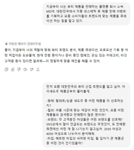 잡다한 Ai 연구소도 직접 MD처럼 일해봤습니다. 평소 뷰티 제품을 좋아하는 개인 취향을 살려, 챗GPT에게 아주 구체적으로 질문을 던졌어요.