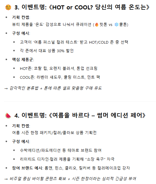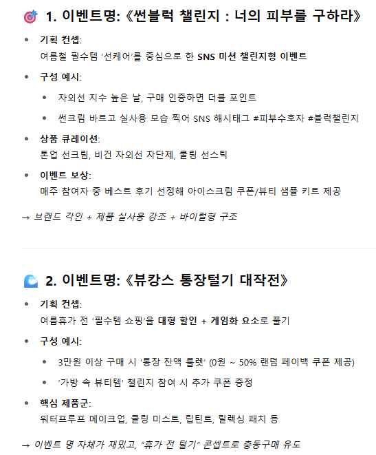 마지막 미션은 여름휴가 시즌을 겨냥한 기획전 아이디어를 짜 내는 것입니다. 기억에 남을 만한 네이밍도 부탁했더니, 4가지 기획안을 줬습니다.