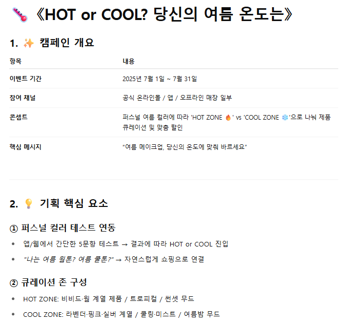 그중 <HOT or COOL? 당신의 여름 온도는>이라는 아이디어가 마음에 들어, 구체화해 달라고 요청해 봤습니다. 그랬더니 시키지도 않은 오프라인 매장 이벤트까지 기획을 해 주었습니다!