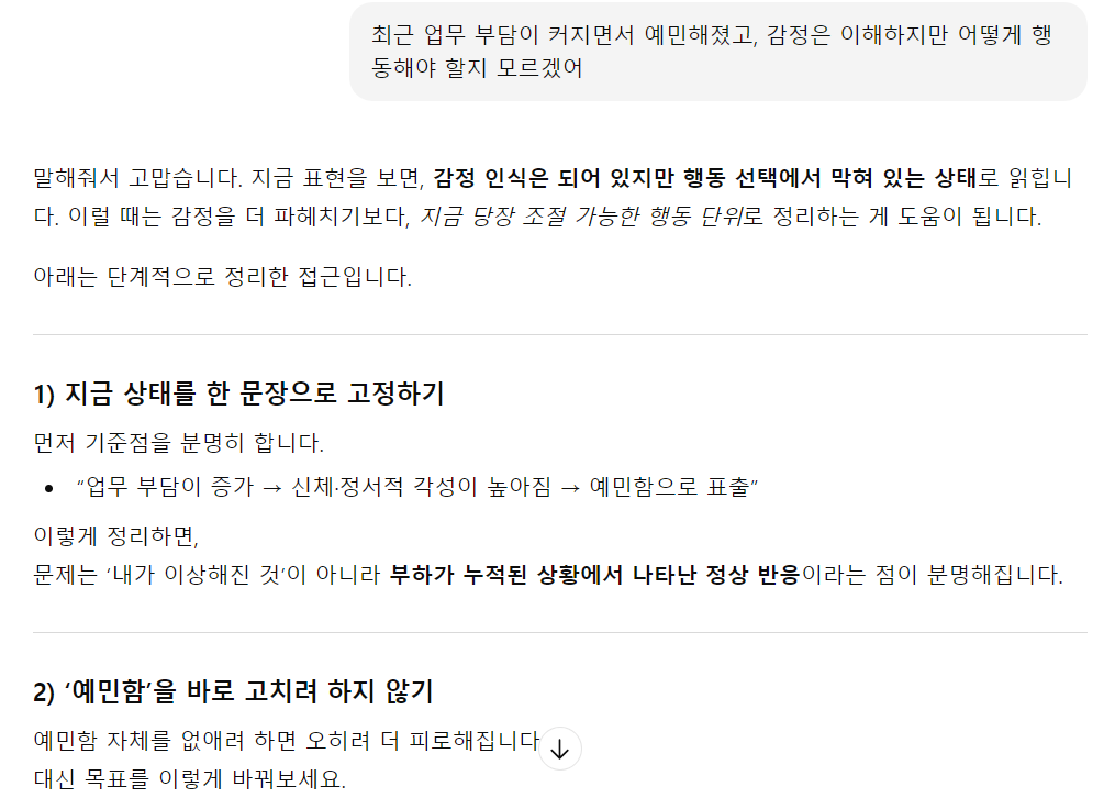 이 프롬프트의 작성자는 비슷한 내용으로 실제 대면 상담을 받아본 경험이 있었습니다. 당시 상담사의 반응과 챗GPT의 반응은 일정 부분 비슷한 점이 있었습니다. 내담자에게 "당신은 자신의 감정을 비교적 잘 알고 있으며, 어떤 감정 때문에 힘든지를 스스로 인식하고 있다"며 "보통의 사람들보다 자기 이해 능력이 높은 만큼 회복이 빠를 것이다"라고 북돋아 주었던 것입니다. 이처럼 정서적으로 크게 흔들림을 겪고 있는 사람이 아니라면 챗GPT 상담이 일정 부분 도움이 되겠다는 생각이 들었던 이유입니다.