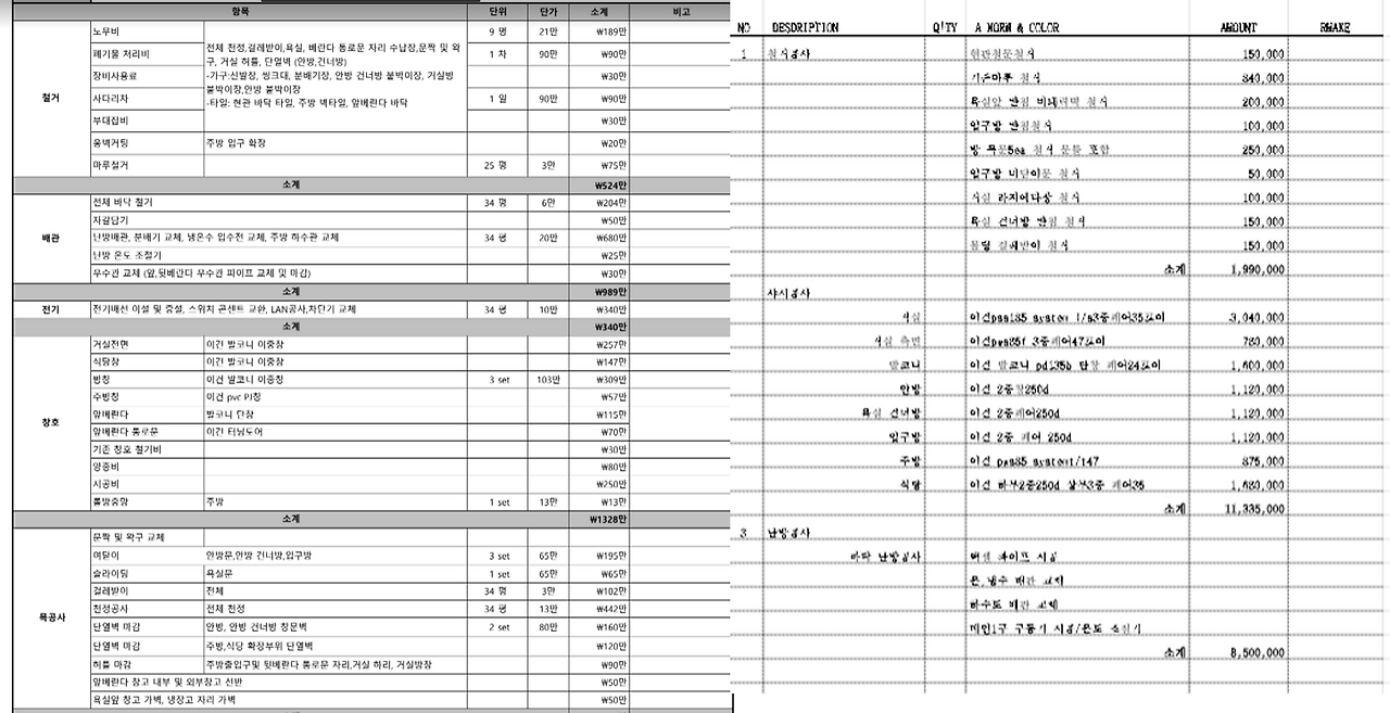 적산이란 개념을 몰랐다. 그러다 보니 견적서를 여러 곳에 받아도 비교가 안된다. 비교를 하려 하면 업체마다 항목을 다르게 표현하고 제품명을 애매하게 넣어둔다. 왜 어느 곳엔 철거비용이 이렇게 큰데, 다른 곳은 적을까. 부엌은 한샘/리바트급이라고 쓰여있는데 가격은 또 왜 이렇게 다른가. 화장실은 비슷한 가격인데 타일비용은 왜 별도 표기인가. 기준이 없으니, 견적서끼리 비교할 수가 없다.