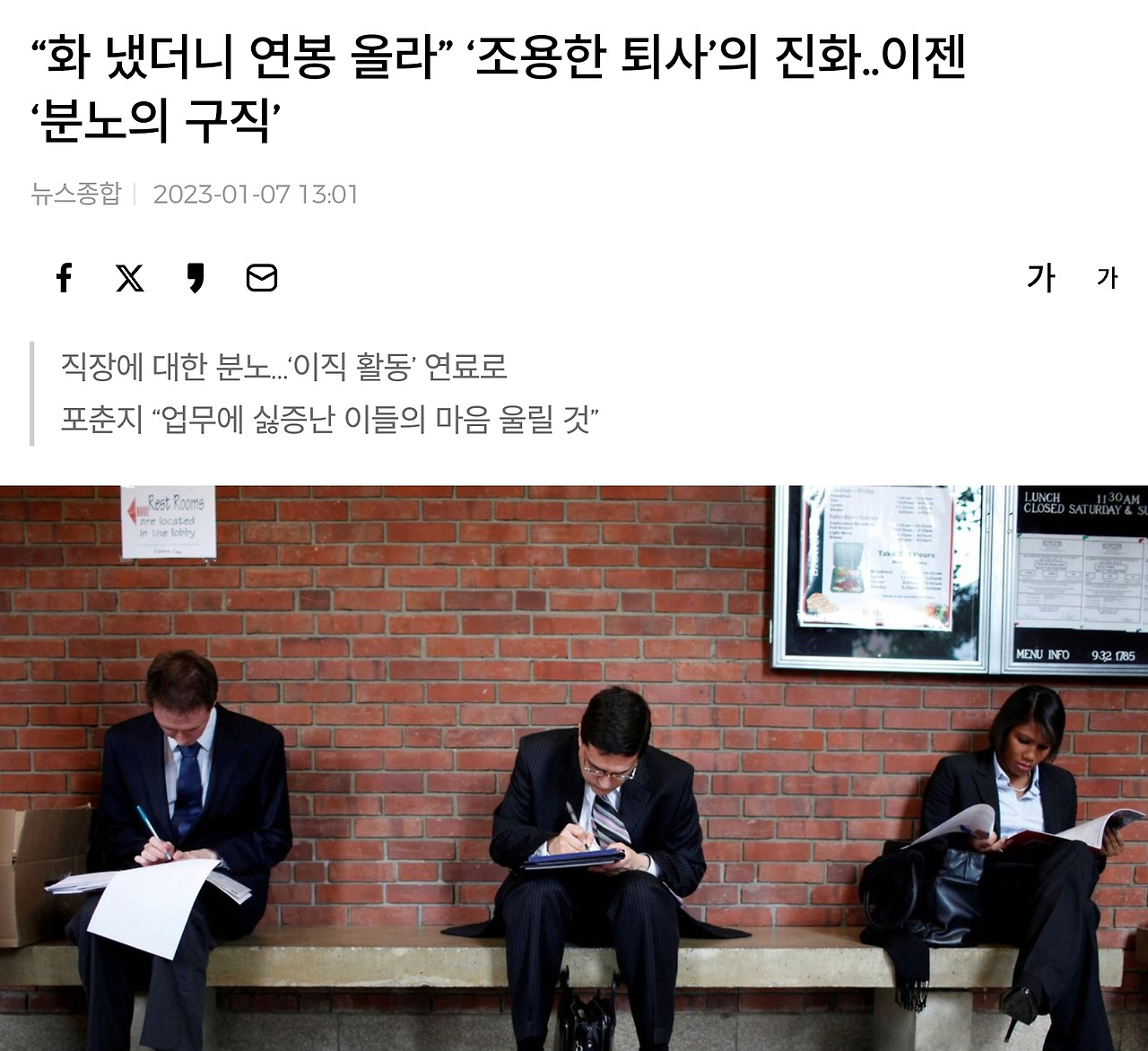 조용한 퇴사자. 유럽에서부터 퍼지던 이 단어는 최근 주위를 보면 흔하게 보이는 케이스이다. 조용한 퇴사자란, 회사에서 딱 남들에게 피해 안 줄만큼만 일하면서, 회사 내의 성장에 관심이 없는 경우를 말한다.