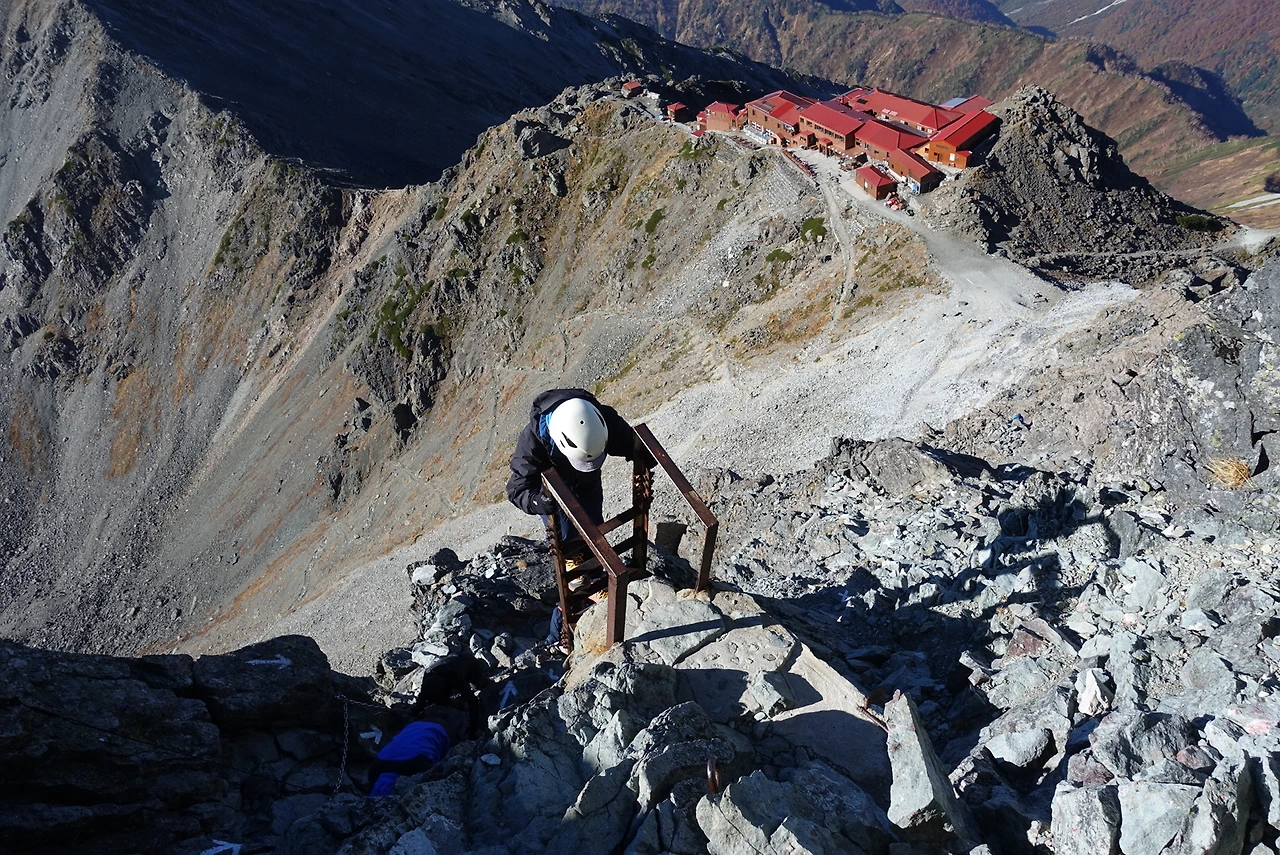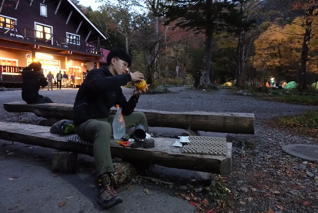 야리가다케 ~ 가리사와 휘테로 가는 일정을 취소했기에 우리 마음은 넉넉했고 산장 앞에서 밥을 먹으며 여유롭게 하산을 시작했다. 아 근데 하산도 만만치 않았다.