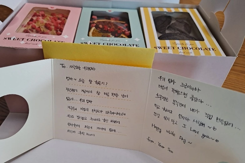 나는 이 카드를 읽으며 왜 그렇게 눈물이 나던지 울다 보니 남편 앞에서 멋쩍었다. 그런 나를 보고 남편은 객쩍게 한마디 했다. 아빠한테는 안 보내고 엄마만 챙긴다고 하며 내가 감격해서 찔찔 짜는 것을 멈추게 했다. '혼자만 먹으라고 보내줬겠어, 같이 먹으라고 보냈겠지" 하며 하나를 건네주었다. 이것을 만드느라 얼마나 부산스럽게 늘어놓고 난리를 쳤을까. 초콜릿을 만들어서 하나하나 수놓듯 장식을 하고 예쁘게 포장하고, 엄마가 기뻐할 생각만으로 아마도 족히 몇 시간의 수고가 있었을 것이다. 나는 점심을 먹다 말고 달달한 초콜릿보다도 아들이 엄마를 걱정해 주는 그 마음이 고마워 더 맛있게 먹었다.