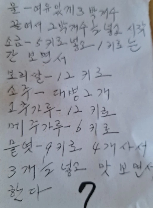 고추장 담그는 데는 비용도 만만치 않지만 이렇게나 많은 재료들이 들어갔었나 새삼스럽기만 합니다. 행여 빠트릴세라 언니가 적어놓은 레시피를 보니 고추장에는 고춧가루 말고도 메주가루, 보리쌀 띠운 것과 물엿, 소주, 물을 끓여 소금을 녹인 물까지 들어갔다네요. 이른 아침부터 이 많은 재료들을 준비하여 빠짐없이 넣고 버무릴 생각에 언니는 분명 잠을 설쳤을 것이고, 그러하니 얼굴에 피곤이 덕지덕지 붙어있을 수밖에요. 잘 저어져 몽글몽글했던 덩어리들은 모두 사라지고 곱디 고운 빨간 고추장이 완성이 되었습니다. 그 빛깔이 그 어느 빨강보다 빛이 나고 언니만큼이나 예쁩니다.
