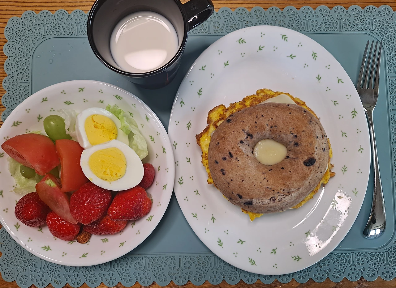 제목만 보면 쥐도 새도 모르게 돌 맞을지도 모르겠다. 다이어트에 관한 글이 올라오기라도 할라치면 너도나도 관심을 갖는 이 마당에 죄라니. 내 글이 더 이상 올라오지 않는다면 내 생사를 확인해 볼 일이다. 출근할 일 없이 살아도 주말은 주말이다. 빼꼼히 눈을 뜨고 토요연재글을 올리고는 다시 침대 속으로 들어가 뒹굴거리다 마지못해 아침을 차렸다. 양상추 한주먹에 삶은 계란 1개, 토마토, 아몬드, 청포도 몇 알과 딸기도 몇 개 넣어 접시를 채우고, 우유 1잔과 블루베리 두부베이글을 반으로 갈라 토스터기에 굽는다. 그 사이에 전날 슬라이스해 놓은 양배추, 양파, 당근 한 줌을 볼에 넣고 계란 1개를 풀어 프라이팬에 부친다. 적당히 익었다 싶으면 바삭하게 구워진 베이글 안에 올려주고 구운 베이컨과 치즈도 한 장 올려준다. 여기까지는 나의 아침이 아니다.