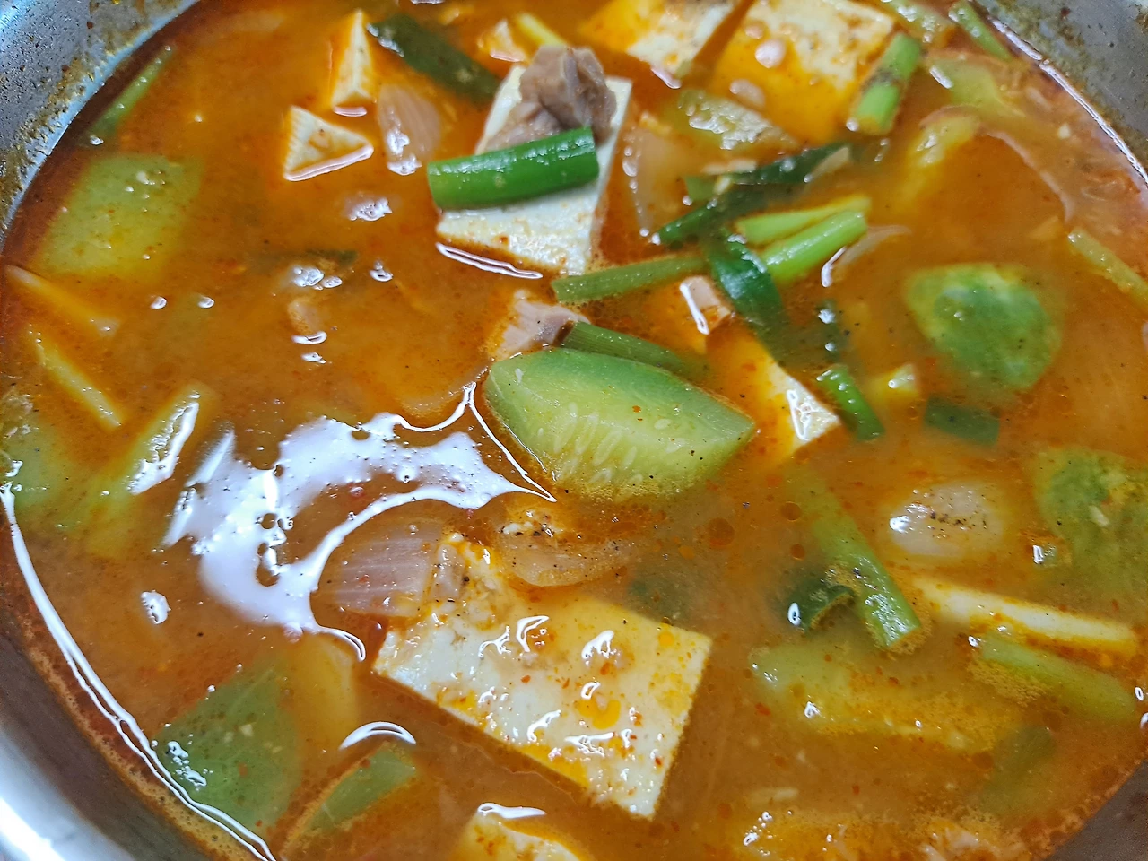그때만 해도 제대로 할 줄 아는 것이 없었기에 옆에서 거들뿐이었는데 형님은 언제나 뚝딱 먹음직스러운 찌개를 대형 코펠에 가득 끓여내시곤 하셨습니다. 그런 맛이 나올지는 모르겠지만 시원한 계곡에 발을 담그고 평상에서 먹었던 그날의 감자참치찌개를 만들어 볼게요. 감자 3개를 깍둑썰기로 썰어주시고, 양파 1개와 호박, 두부도 같은 크기로 잘라주고, 참치 1캔(100g)과 파, 마늘을 준비합니다. 먼저참치캔을 조금만 따서 냄비에 기름을 붓고 자른 양파, 감자, 호박을 부서지지 않게 코팅하듯 볶아주었어요. 살짝 익었다 싶을 때 고추장 한 스푼을 넣어 간이 배도록 뒤적이다 집된장 2스푼을 쌀뜨물 5컵(750리터))에 걸러서 넣어줍니다.