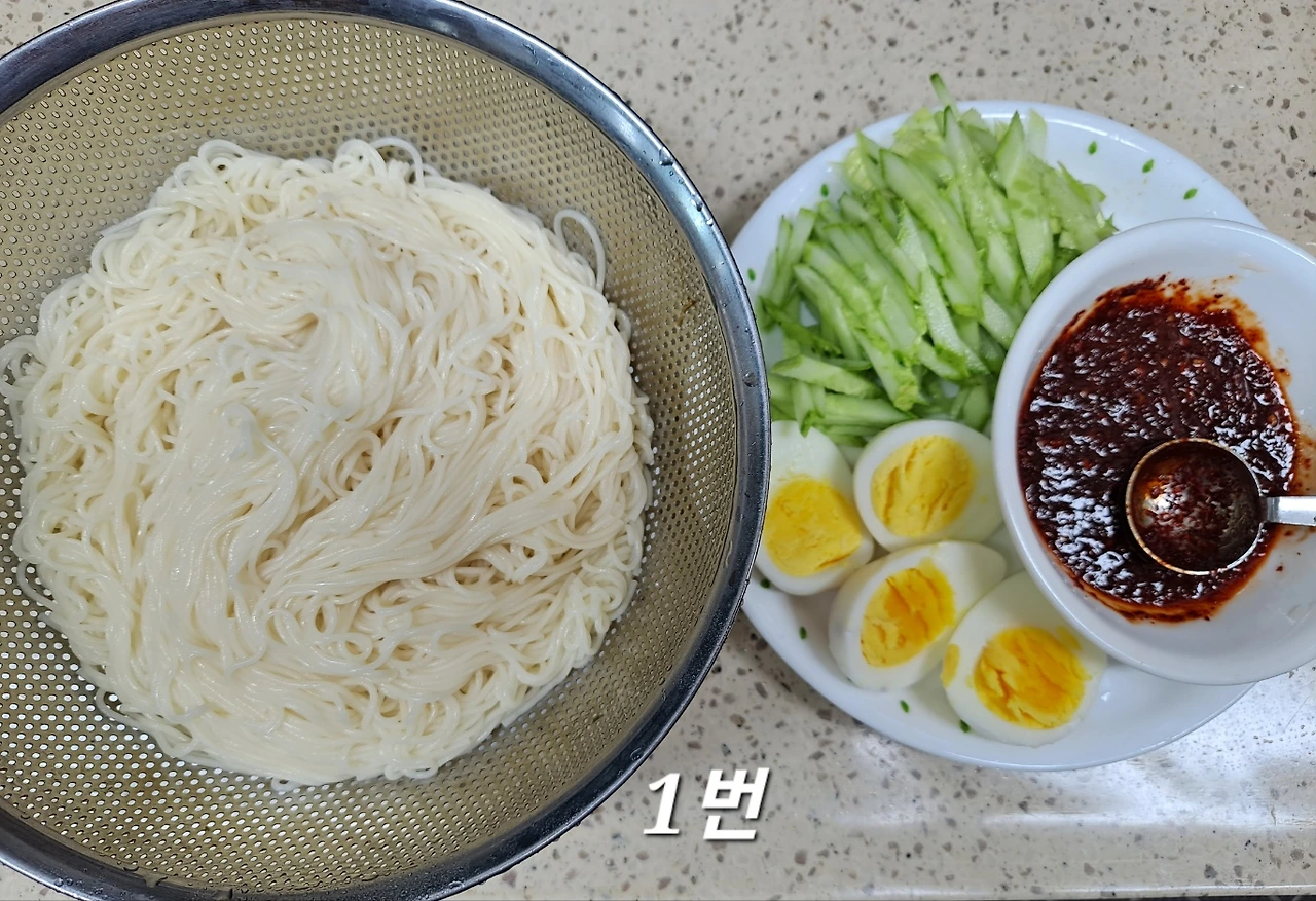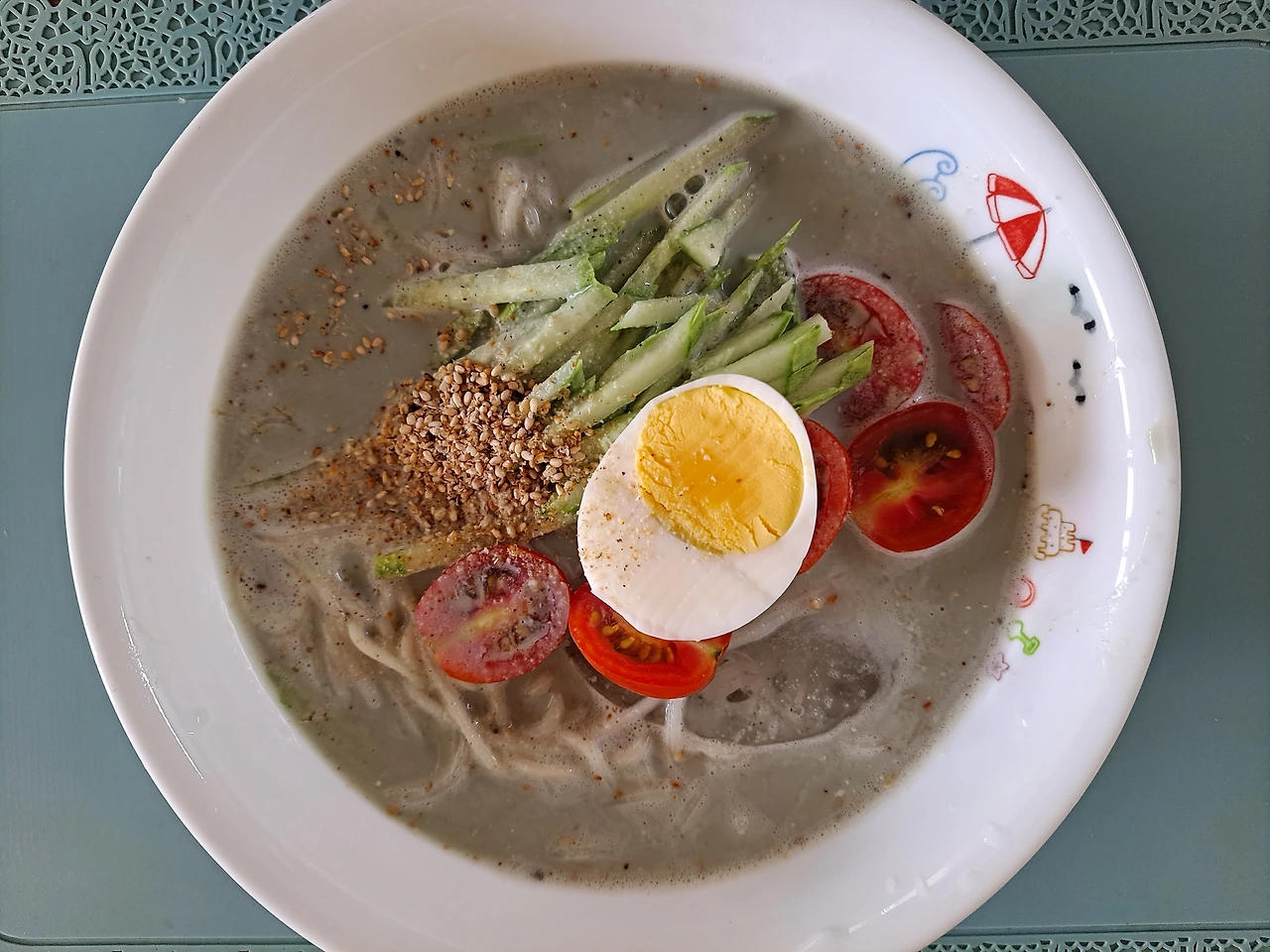삶고 갈고 짜주고 번거롭긴 해도 그만큼 고소하고 맛있으니 한 번쯤 해 먹을 만해요. 이제 우리 밀면 1인분을 끓는 물에 5분 정도 더 삶아서 얼음물에 헹궈 그릇에 담고 얼음 몇 조각과 콩물 2컵(400ml)을 붓고 고명으로 채 썬 오이와 빨간 방울토마토, 계란 반쪽과 깨소금 올려주면 마무리가 되는데요. 간은 취향껏 소금으로 맞춰주세요(콩국물이 파랗고 먹음직스러운데 사진발이 안 좋아 아쉽네요). 오랜만이어서인지 콩물이나 콩가루를 구매해서 먹은 것과는 비교불가 정말 고소하고 부드러우니 맛있습니다. 유난히 더운 여름 얼음 띄운 콩국수로 매미들의 긴긴 노랫소리와 함께 시원한 여름 보내세요.