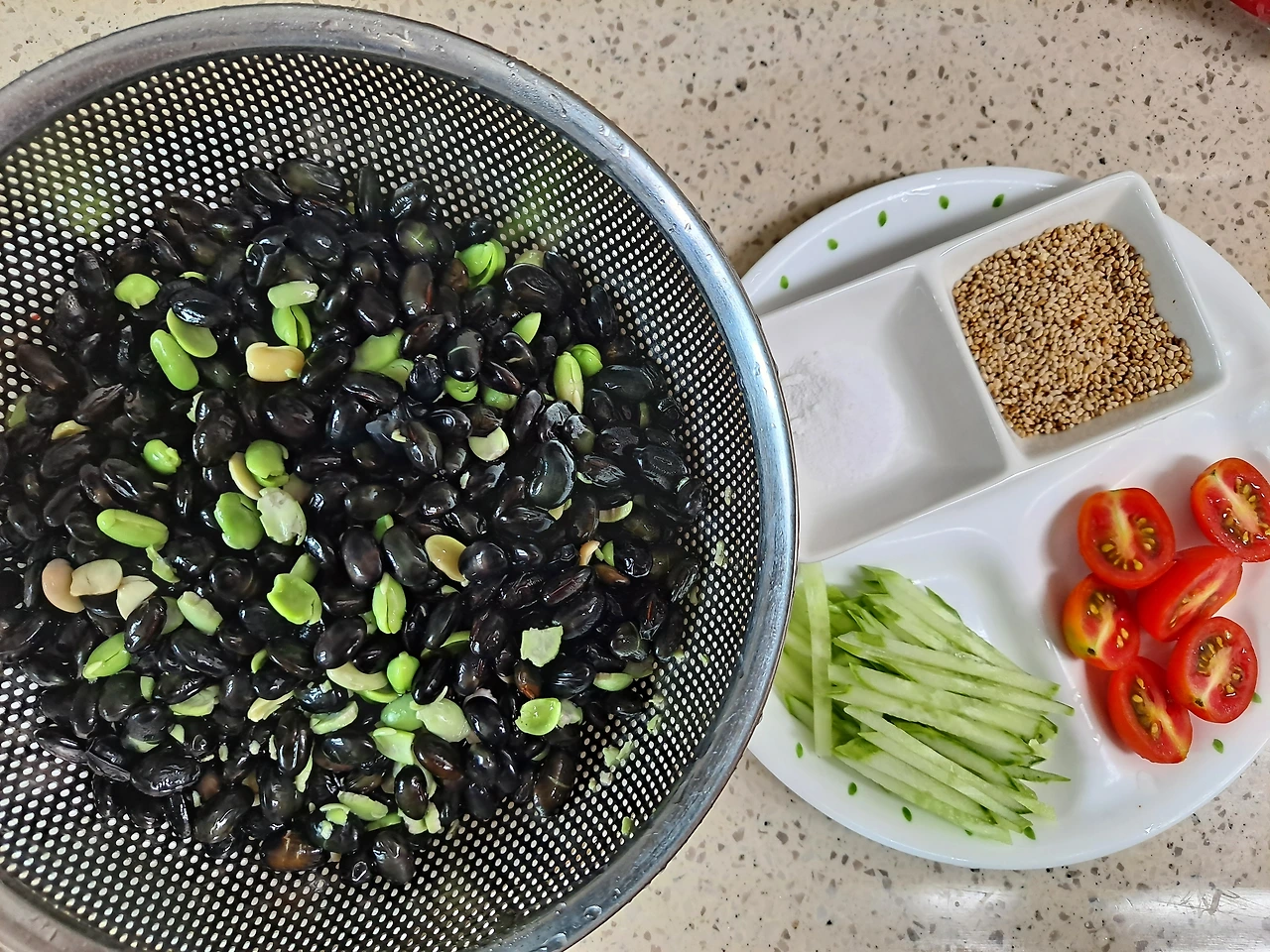 서리태 300g을 6시간 정도 담갔다가 콩이 물에 잠기도록 하여 삶아줍니다. 금세 끓어 넘칠 수 있으니 자리를 꼭 지키셔야 합니다. 안 그러면 검은 물바다가 되어 일이 더 커져버려요. 끓기 시작하여 5분 정도 후 한 알을 먹어보니 고소하고 비린맛이 없어 소쿠리에 건져 찬물샤워해 주었어요. 서리태는 겉은 검은색이지만 속이 파란색인데 간혹 노란 것이 있어요. 새들이 모두 제 것인 양 이 밭 저 밭 물고 드나들어 같은 콩을 심어도 그렇다네요. 잘 삶아진 콩을 믹서기에 물 5컵을 넣고 곱게 갈아 면자루에 한번 짜주고 다시 물 2컵을 넣고 갈아서 꼭 짜줍니다. 이 과정이 제일 번거롭긴 해도 부드럽게 먹을 수 있는 과정이니 해야겠지요. 이때 생수는 미리 냉동실에 살짝 얼려두었다가 해주면 좋습니다. 이제 부드럽고 고소한 콩국물이 되면서 거친 콩비지만 남습니다. 마지막으로 콩국물 1컵에 통깨(땅콩)를 3스푼 넣어 갈아서 섞어주면 훨씬 더 고소한 콩국물이 됩니다. 혹시 땅콩이 있으시다면 함께 갈아서 넣어주면 훨씬 더 고소하고 맛있습니다.