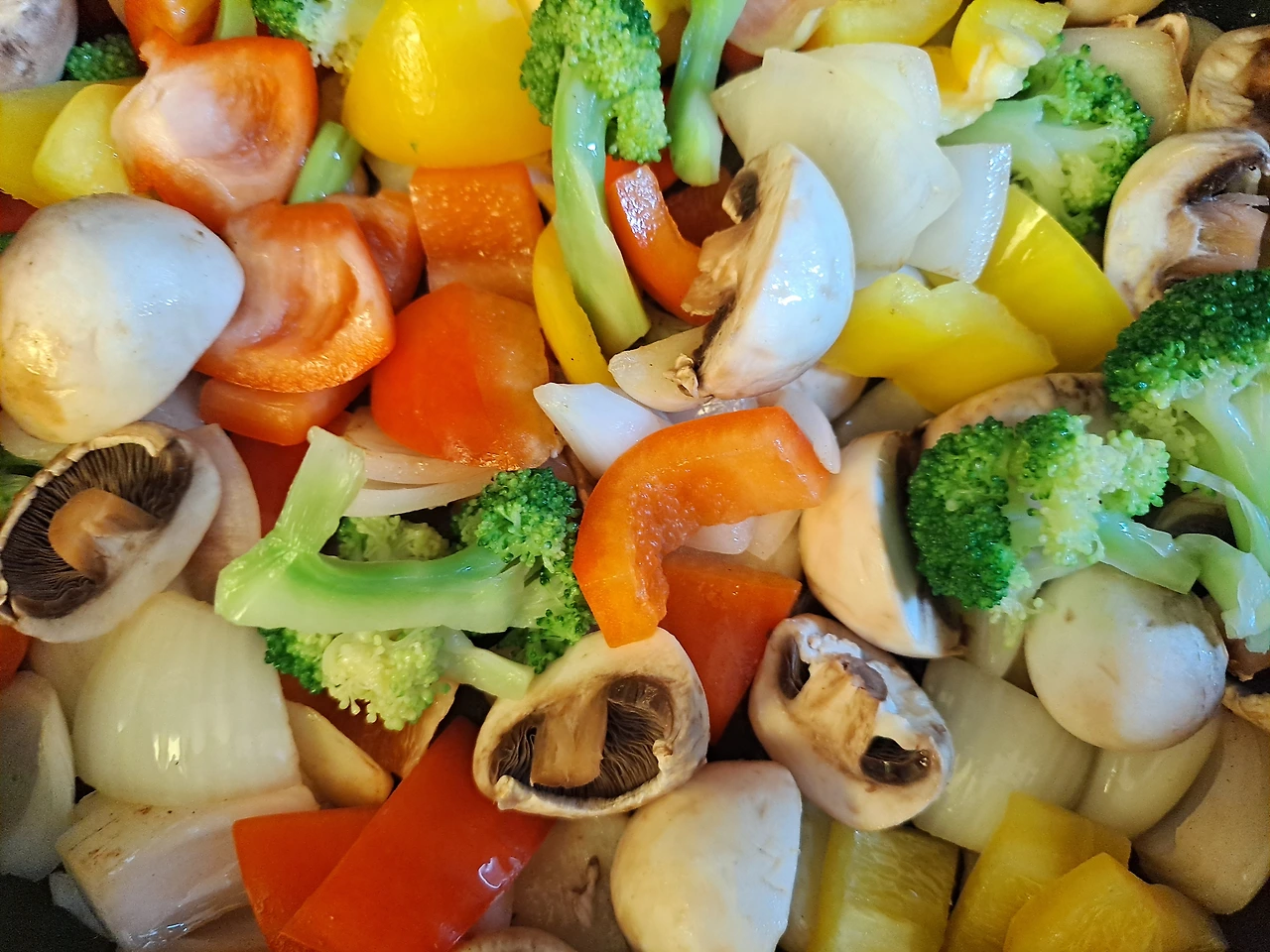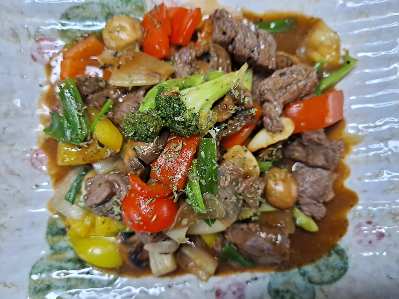 소고기안심을 덩어리째 사 와서 손질하여 구워 먹고, 남은 고기는 휴가를 떠나면서 어쩔 수 없이 냉동을 시켜놓고 갔어요. 다시 해동하여 구워 먹으면 아무래도 처음보다는 맛이 떨어지겠지요. 집에 있는 각종 야채와 양념들을 더하여 간단하게 찹스테이크를 해 먹으려고 합니다. 이미 찹스테이크를 해 먹으려고 깍두기 모양으로 적당하게 썰어서 냉동시킨 고기를 전날 꺼내어 냉장해동을 했어요. 해동된 고기(350g)의 핏물을 완전히 닦아 준 후에 스테이크 시즈닝 솔트와 올리브유 1스푼을 넣어 간이 배도록 조물조물해 줍니다. 들어갈 야채로는 파프리카, 브로콜리, 통마늘, 양파, 양송이버섯, 실파를 준비했어요. 손자들을 위한 반찬을 하다 보니 웬만한 야채들이 거의 다 있어서 양송이버섯만 구매했어요. 몇 가지 빠져도 있는 재료로 양념소스 만들어서 넣고 간만 잘 맞추면 어렵지 않은 요리입니다.