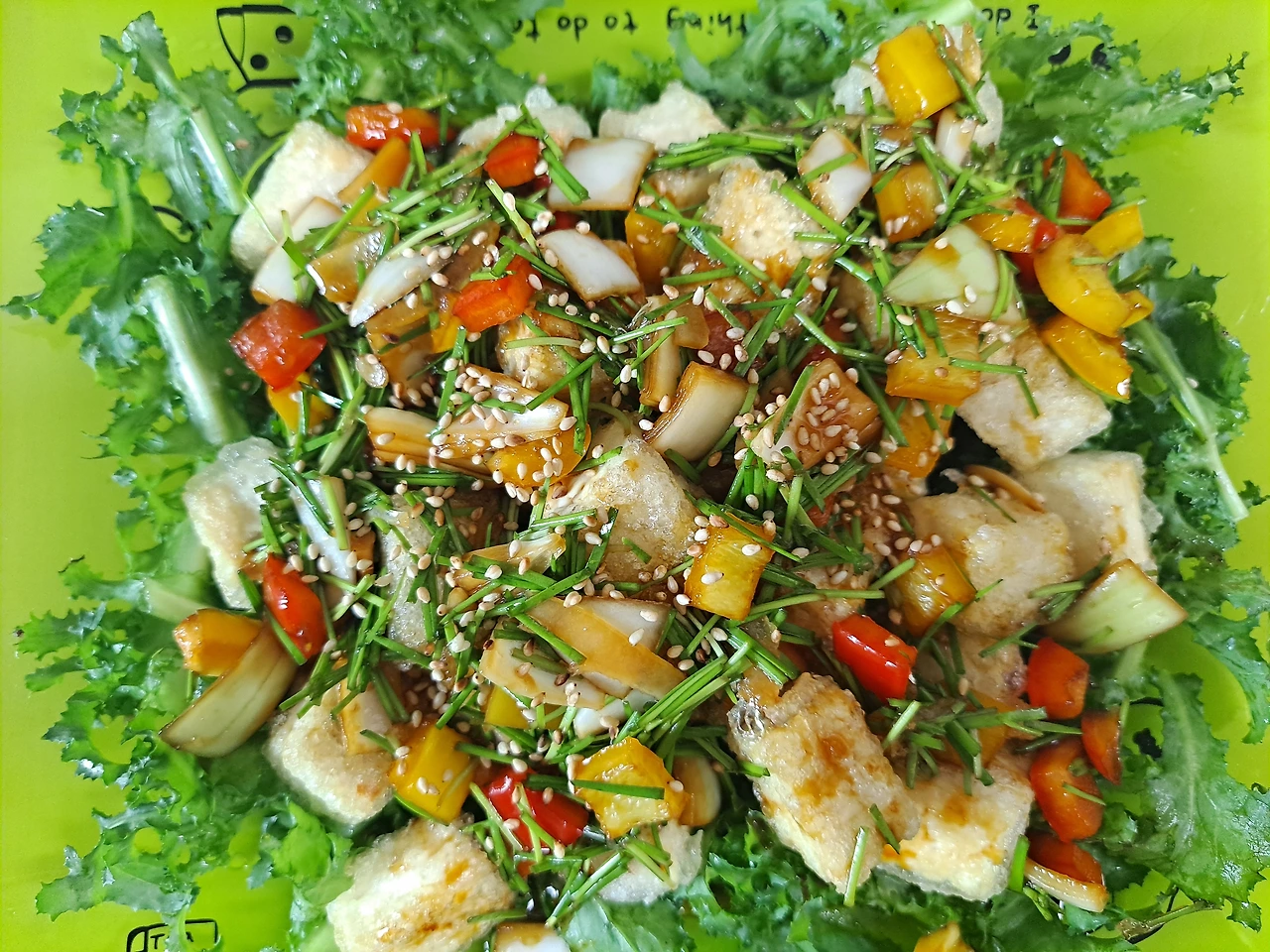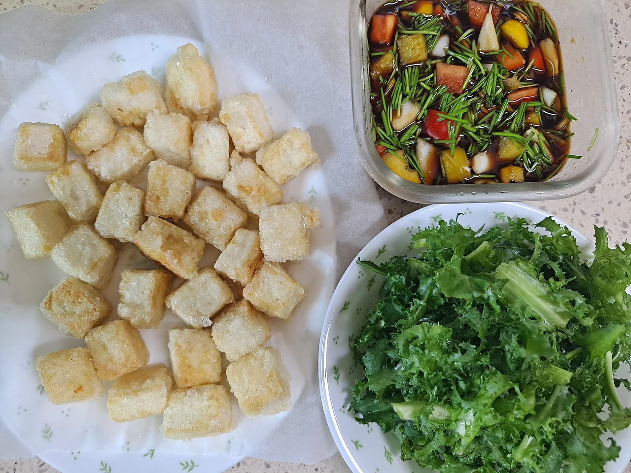 두부를 튀기기 전에 준비한 치커리를 먹기 좋게 뚝뚝 끊어 깨끗이 씻어 물기를 빼주세요. 모든 준비가 되었으니 이제 두부를 튀겨줄 건데요. 비닐봉지에 감자전분을 넣고 물기를 제거한 두부를 넣고 살살 뒤집어가며 골고루 묻혀 팬에 식용유 넉넉하게 부어 사방이 바삭해지도록 골고루 튀기듯 구워주면 재료준비가 끝났어요. 두부를 구울 때는 전분 때문에 서로 달라붙으니 간격을 두고 노릇하게 튀겨주세요. 이제 예쁜 접시를 꺼내어 물기를 뺀 치커리를 깔고 튀긴 두부를 올려주세요. 이어 만든 소스에 썰어둔 야채들을 섞어주고 꼭 참기름도 넣은 뒤 섞어서 두부 위에 골고루 뿌려주면 완성입니다. 이때 참깨도 조금 뿌려주었어요. 새콤달콤한 소스와 고소한 두부, 쌉싸름한 치커리가 어우러져 상큼하니 건강한 두부샐러드 강추입니다.