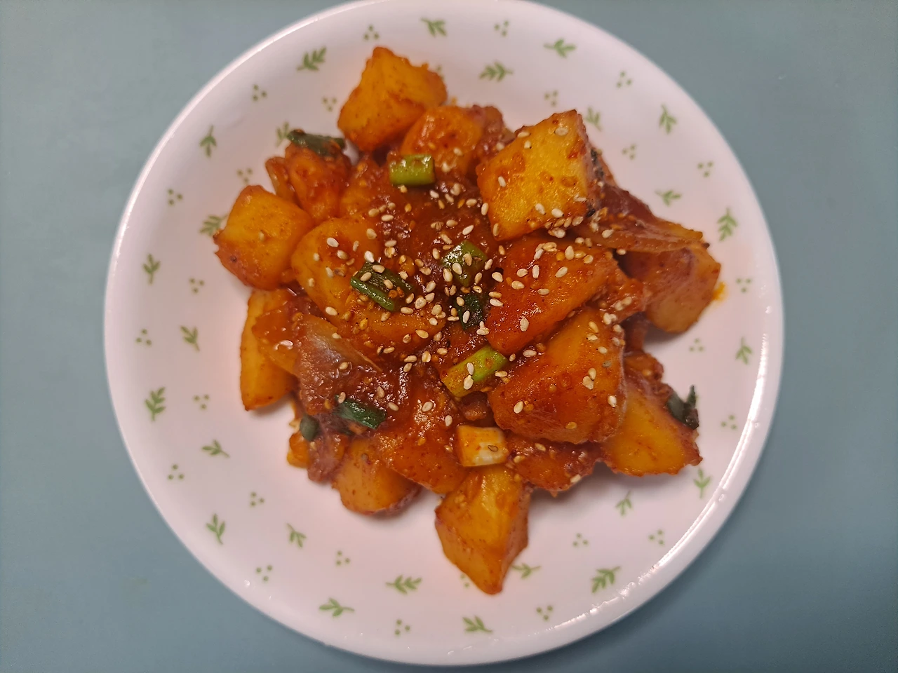 이제 양념장을 만들어 볼게요. 고추장 2스푼, 고춧가루 반스푼, 양조간장 1스푼, 올리고당 2스푼, 마늘 1스푼을 넣어 골고루 섞어주세요. 이제 팬에 식용유를 1스푼 두르고 감자와 양파를 넣고 감자가 부서지지 않도록 코팅하듯이 5분 정도 볶아주세요. 적당히 볶아졌다 싶으면 물 1컵 (200ml)과 설탕 1스푼을 넣은 다음 뚜껑을 닫고 중불에서 익혀주세요. 가끔 열고 저어주다 거의 물이 없어질 즈음 양념장을 부어 졸여줍니다. 양념이 졸아들고 조금 남았을 때 썰어 놓은 파와 깨소금, 후추, 들기름 반스푼을 넣어 마무리했어요. 부족한 간은 간장과 설탕으로 하면 되겠지요. 매콤 달콤 맛있다 하니 기분이 좋습니다. 이 맛에 요리합니다.