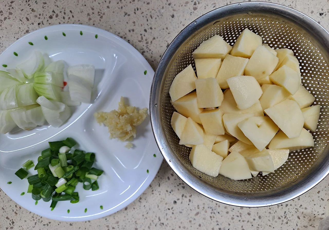 마지막으로 남의 편, 아니 이제 내편이 되어가는 남편을 위한 고추장 감자볶음을 해보겠습니다. 요즈음 감자가 풍부하여 여러 가지 감자반찬들을 마음껏 만들어 먹을 수 있었는데요. 그중에서도 시어머니께서 자주 해주시던 고추장감자볶음을 그냥 지나치면 안 되겠지요. 손주들 때문에 맵지 않은 간장조림이나 하얀 볶음만을 만들었더니 얼마 전부터 매콤한 그 맛이 그리웠나 봅니다. 저도 좋아했었지만 맵찔이가 되어 까마득히 잊고 있었는데 먹고 싶다는데 해야지요. 감자 3개를 껍질을 벗겨서 세모나게 깍두기 크기로 잘라 전분을 씻어내고 소금으로 10분 정도 절였다가 다시 헹구어 준비합니다. 같이 들어갈 재료는 작은 양파 1개를 감자와 같은 크기로 썰고 잘게 썬 실파 2스푼 정도 준비합니다.