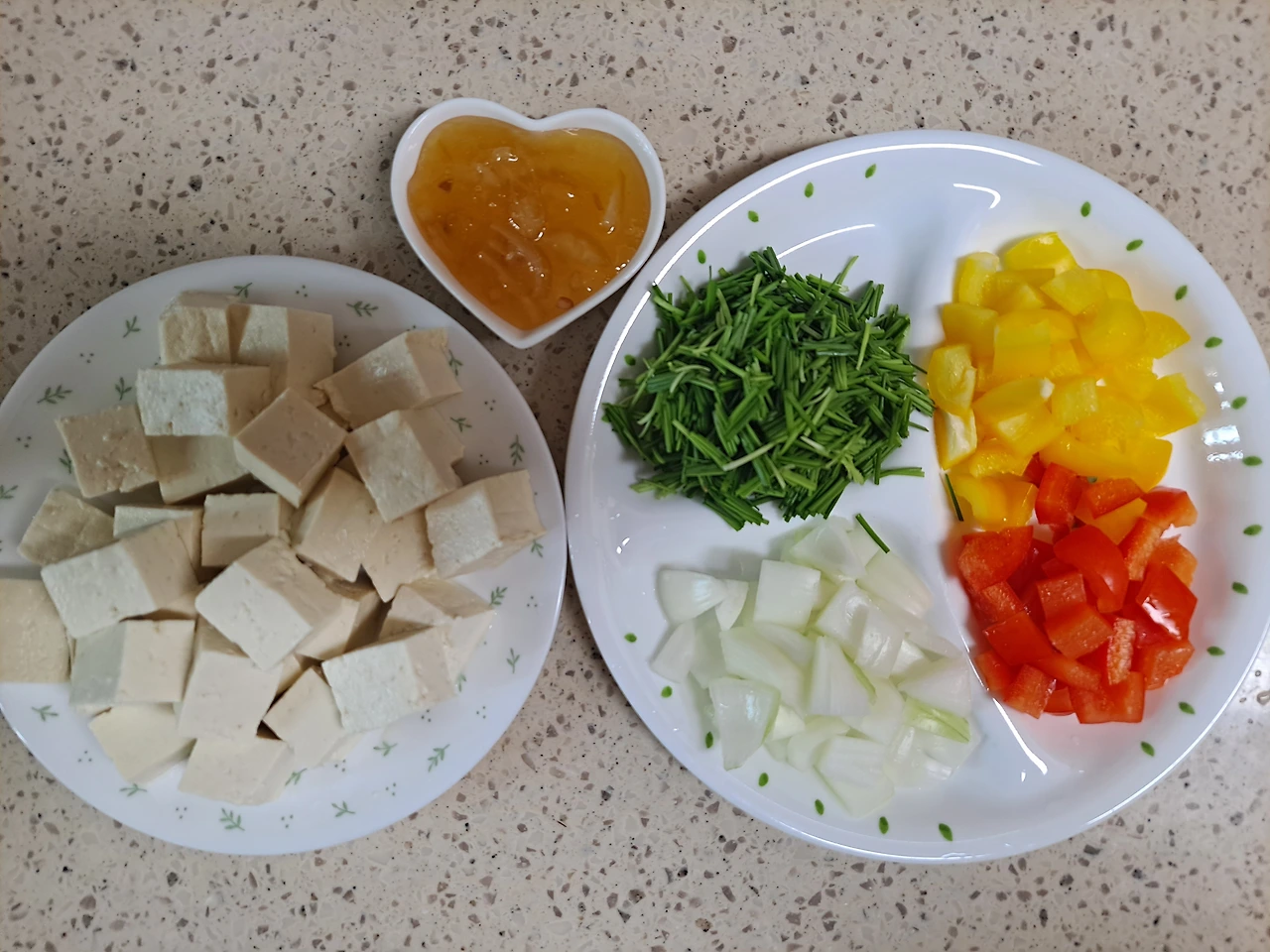 두 번째로는 저의 시그니쳐 메뉴인 야채와 두부가 어우러지는 건강한 두부샐러드를 만들어 보겠습니다. 집들이나 친구들 몇 명 초대해서 내놓으면 인기폭발할 수 있는 메뉴입니다. 반응이 항상 뜨거웠거든요. 재료는 두부 1모(300g)와 치커리 한 줌과 영양부추, 양파 반 개, 파프리카등이 조금만 있으면 되는데요. 날이 더워서 두부를 튀기는 수고가 필요하니 선선해지면 그때 해보실 것을 권해드리고 싶네요. 맨 먼저 단단한 두부의 물기를 완전히 제거하고 큰 깍두기 모양으로 썰어주세요.