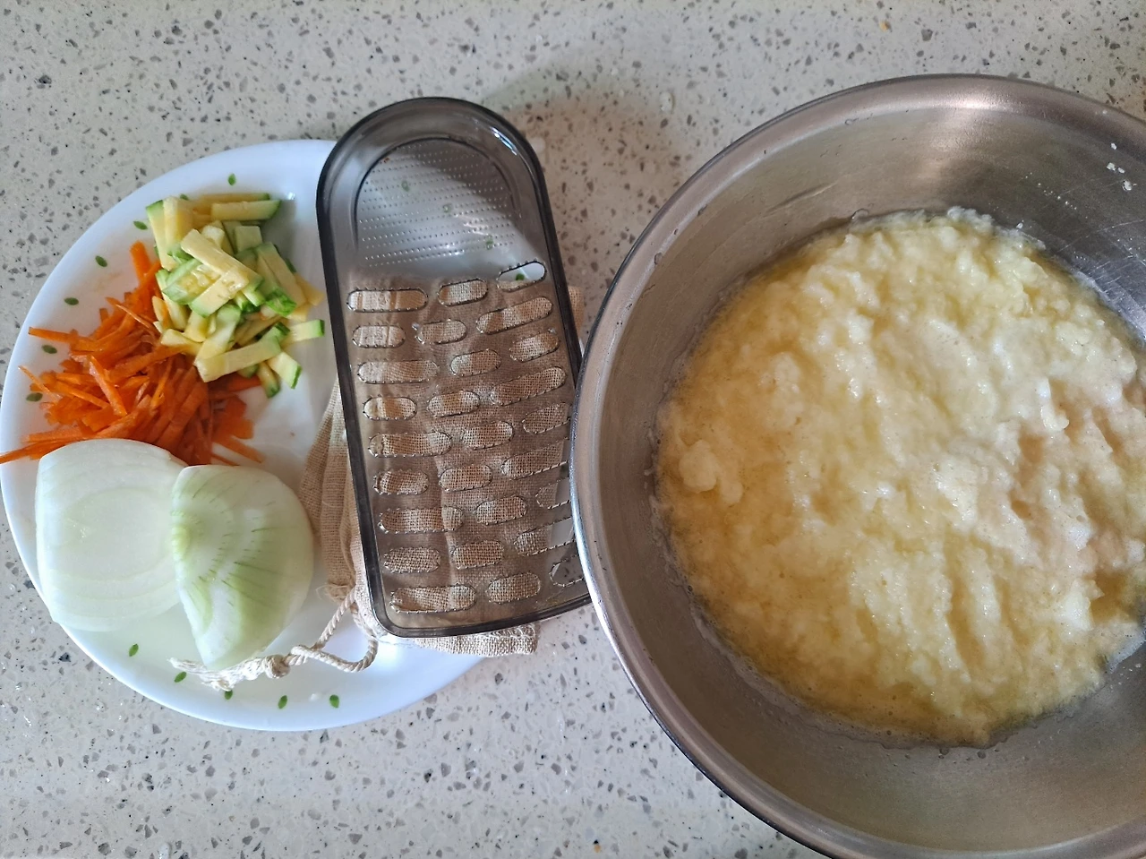손자들이 방학이다 보니 점심, 저녁을 차려줘야 하는데 방학 전부터 많은 일들이 있었고, 휴가까지 다녀오다 보니 계획했던 반찬들을 다 만들지 못했어요. 일정에 맞추려니 쉬지도 못하고 이 더운 날씨에 감자전을 하겠다고 감자 5개를 강판에 갈았습니다. 강판에 갈다 손을 다칠 수도 있으니 무리하지 마시고 갈다 남는 감자와 양파꼬다리는 감잣국을 끓일 때 사용하면 좋아요. 강판에 곱게 간 감자는 고운 베자루에 넣어 짜서 감자전분을 만들기 위해 가라앉혀 줍니다. 5분 정도만 지나도 전분이 잘 가라앉으니 겉물을 조심스레 따라서 버리면 바닥에 하얀 전분만 남습니다. 적당히 짠 건더기는 다른 양푼에 담아 양파를 갈아주고 살짝 절인 호박과 당근을 넣고, 준비한 전분으로 반죽을 해주면 딱 적당합니다. 이때 소금 한 꼬집 넣고 넉넉하게 포도씨유를 두른 팬에 적당한 크기로 반죽을 펴서 부쳐주면 노릇한 감자전 완성입니다. 어렵지 않아요. 어느 정갈한 한식당에 갔더니 곱게 채 썬 호박과 당근을 넣은 감자전이 맛있었기에 그렇게 해 먹고 있어요. 초간장을 만들어 찍어 먹으면 쫀득 바삭하면서도 맛있는 감자전이 그만입니다. 윤이와 훈이도 맛있게 잘 먹었답니다. 더위가 한풀 꺾이면 아이들과 함께 만들어 보아도 좋을 것 같습니다.