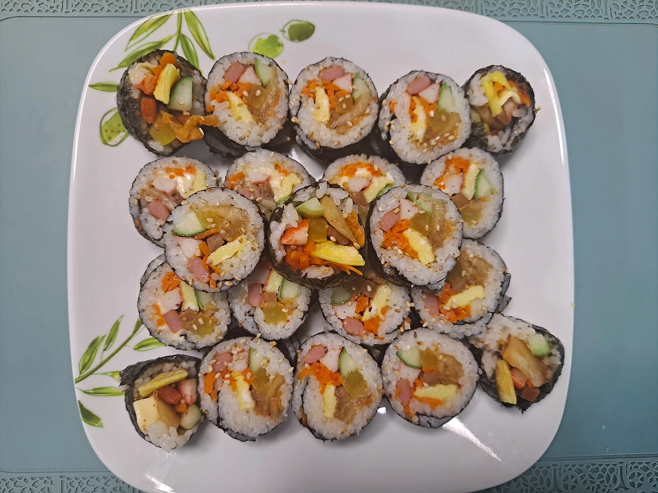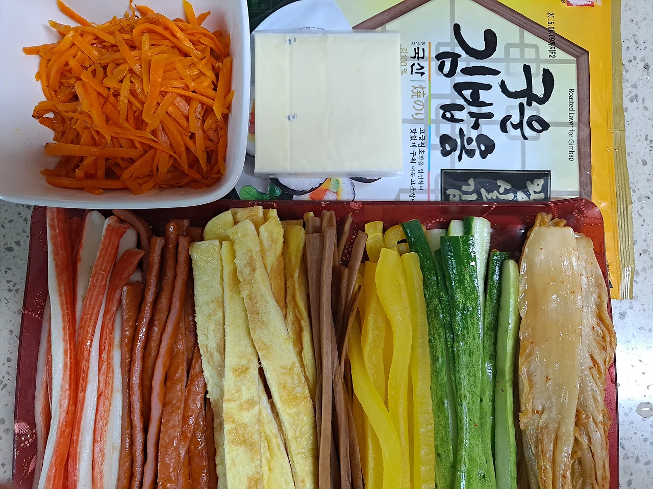 마지막으로 만만한 김밥을 만들어 보겠습니다. 계속 밥과 반찬만 주기보다는 가끔씩은 김밥을 만들어주기도 하는데 손자들도 언제나 좋아합니다. 특히 치즈김밥이나 돈가스김밥은 대환영이지요. 재료는 여느 집과 크게 다르지 않은데요. 밥은 다시마 한 조각을 넣어 약간 되직하게 하여 소금, 식초, 참기름, 통깨를 넣어 솔솔 섞어줍니다. 김밥재료가 푸짐한데요. 요즘 장마로 인해 시금치값이 어마어마 하기에 오이를 김길이로 잘라서 소금에 살짝 절여 주고. 김장김치도 살짝 헹구어 알맞게 잘라 꼭 짜서 설탕, 들기름 약간 넣어 센 불에 잠시 볶어주었습니다. 나머지 재료로는 채 썰어서 볶은 당근. 햄, 맛살, 지단, 우엉, 단무지, 치즈, 나중에 몇 줄 준비한 돈가스까지 무려 10가지입니다.