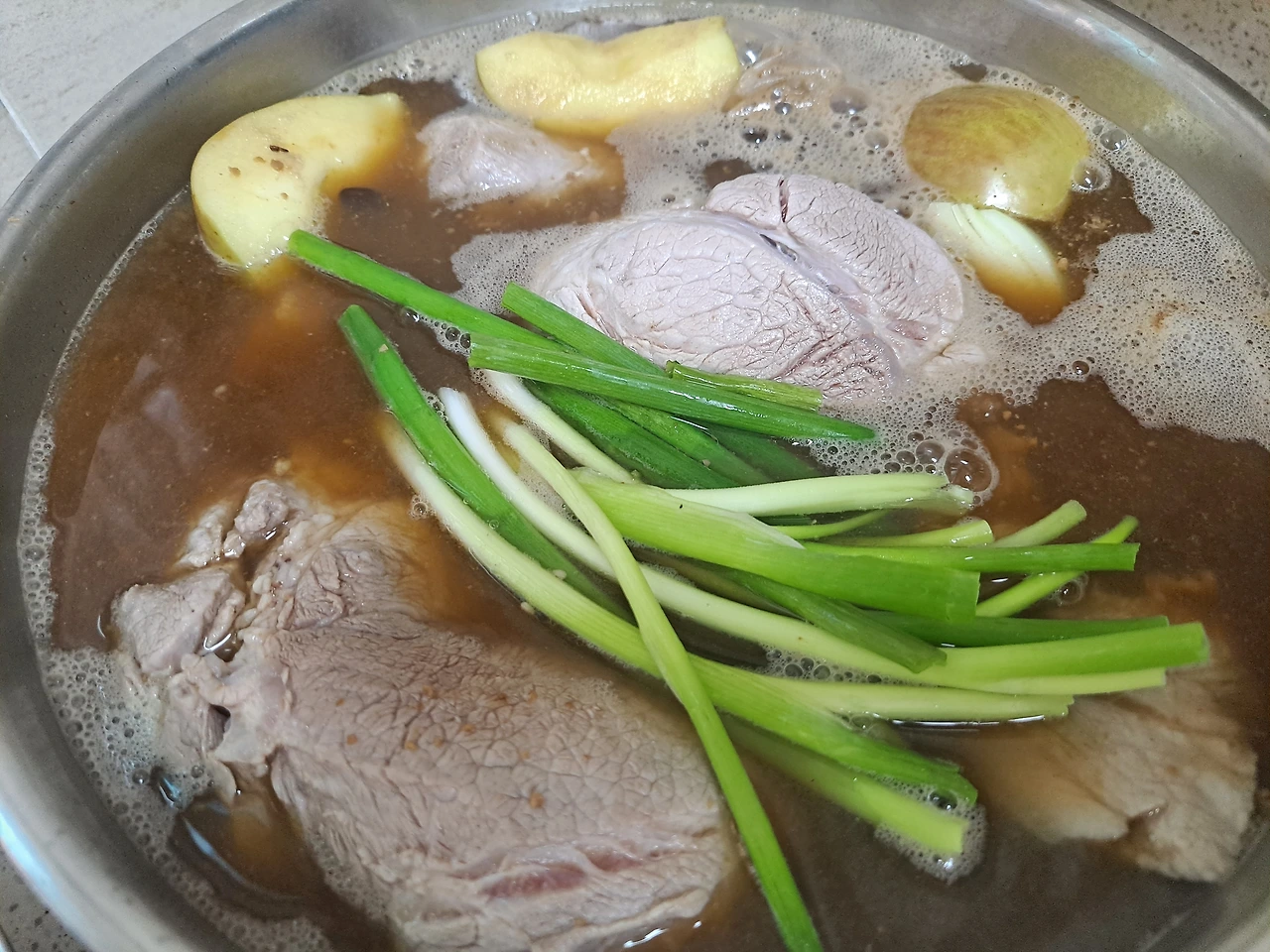 정육점에서 돼지고기 앞다리살 2근(1.2kg)을 사 왔습니다. 지난번에도 삼겹살과 앞다리살을 사다 삶았는데 정육점사장님 말씀대로 신선해서인지 앞다리살이 손자들과 먹기에는 기름기도 없고 더 맛있었어요. 큰 냄비에 넉넉하게 물을 올리고 월계수 잎 5장에 통후추 반스푼 넣고 생강 5쪽을 넣어 팔팔 끓는 물에 삶기 좋게 썰어주신 고기를 한번 씻어 넣어줍니다. 고기의 기름기와 잡내를 제거해 주기 위해 살짝 데친 물은 버릴 거예요. 다시 끓기 시작하면서 5분 정도 되었을까요. 겉면이 살짝 익어가려는 순간 꺼내어 불순물과 기름기가 우러난 물은 버리면서 고기를 건져 두고 다시 새물을 받은 냄비에 본격적인 재료들을 넣어줍니다. 된장 크게 3스푼, 정종 100ml, 양파 1개, 마늘 한 줌, 사과도 1개 넣었어요.