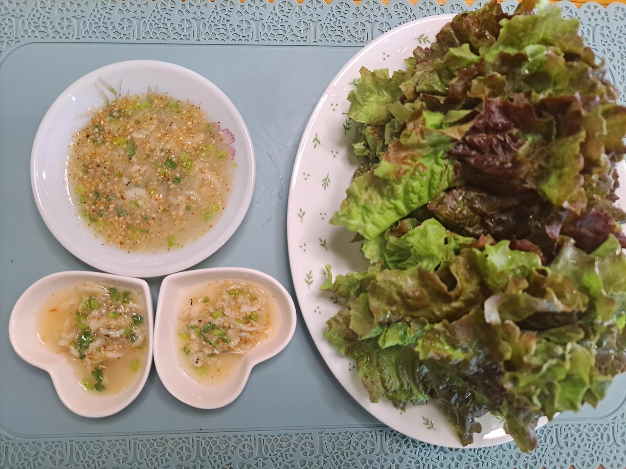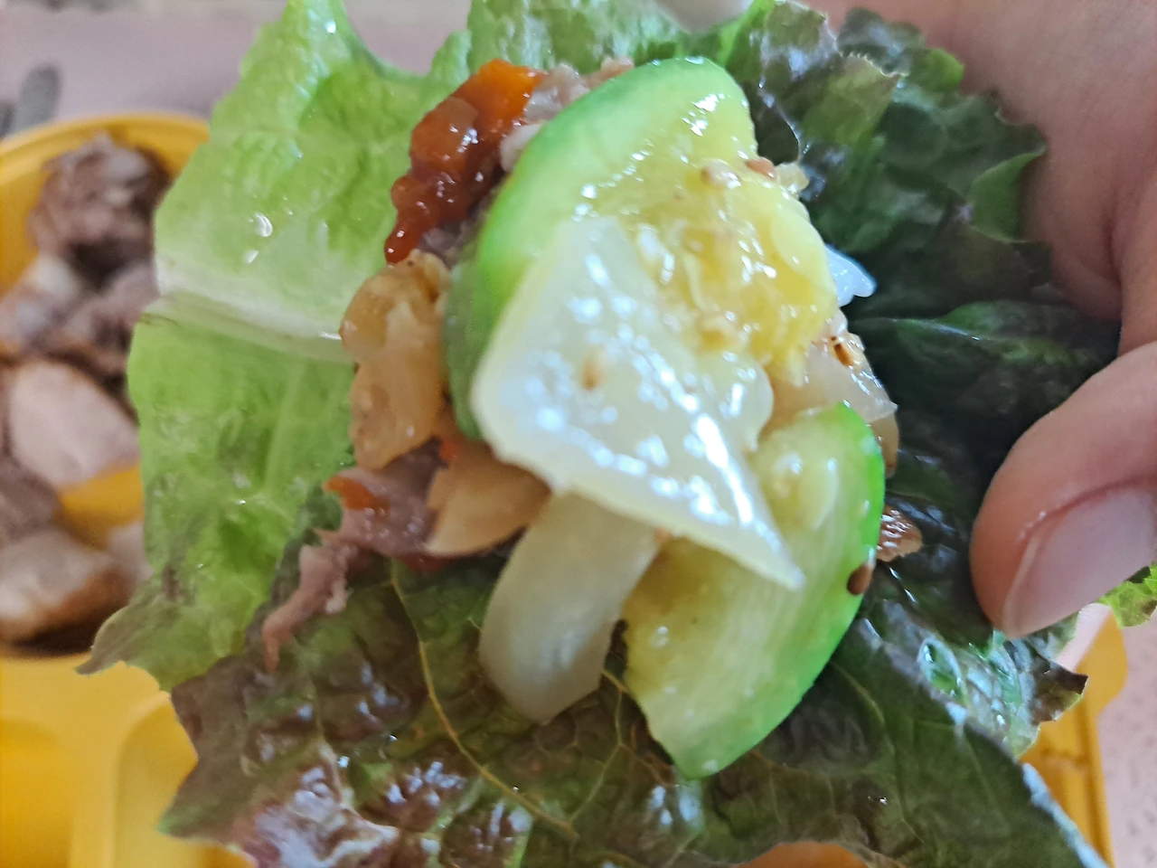 한소끔 끓어오를 때 건져둔 고기를 넣고 대파가 없어 실파 한 줌 올려 40분 정도 삶아주다 나무젓가락으로 찔러보면 푹 들어간다 싶을 때 불을 껐습니다. 잘 익었다는 것이겠지요. 잡내도 없고 기름지지 않고 부드러워 손자들과 먹기에는 아주 알맞게 삶아졌어요. 요즘 비싼 상추도 씻어서 식탁에 올리고, 꼭 보쌈엔 새우젓이라고 외치는 훈이를 위해 짠 새우젓에 깨소금, 물 반스푼과 설탕 한 꼬집. 후추 조금, 파, 마늘과 참기름 한 두 방울(손자들과 먹을 거라 고춧가루는 생략했으니 꼭 조금만 넣어주세요) 떨어트려 준비했어요. 이제 주인공인 고기를 건져 먹기 편하도록 얇게 썰어서 접시에 담아내었더니, 쌈장파 윤이가 상추에 밥과 고기 올리고, 새우젓 한 개, 쌈장, 호박볶음까지 올려 얼마나 맛있게 먹는지요. 먹는 것만 보아도 배가 부르다는 말은 이럴 때 쓰이는 거겠지요. 우리 부부도 싱싱한 상추쌈에 올려서 맛있게 먹었답니다.