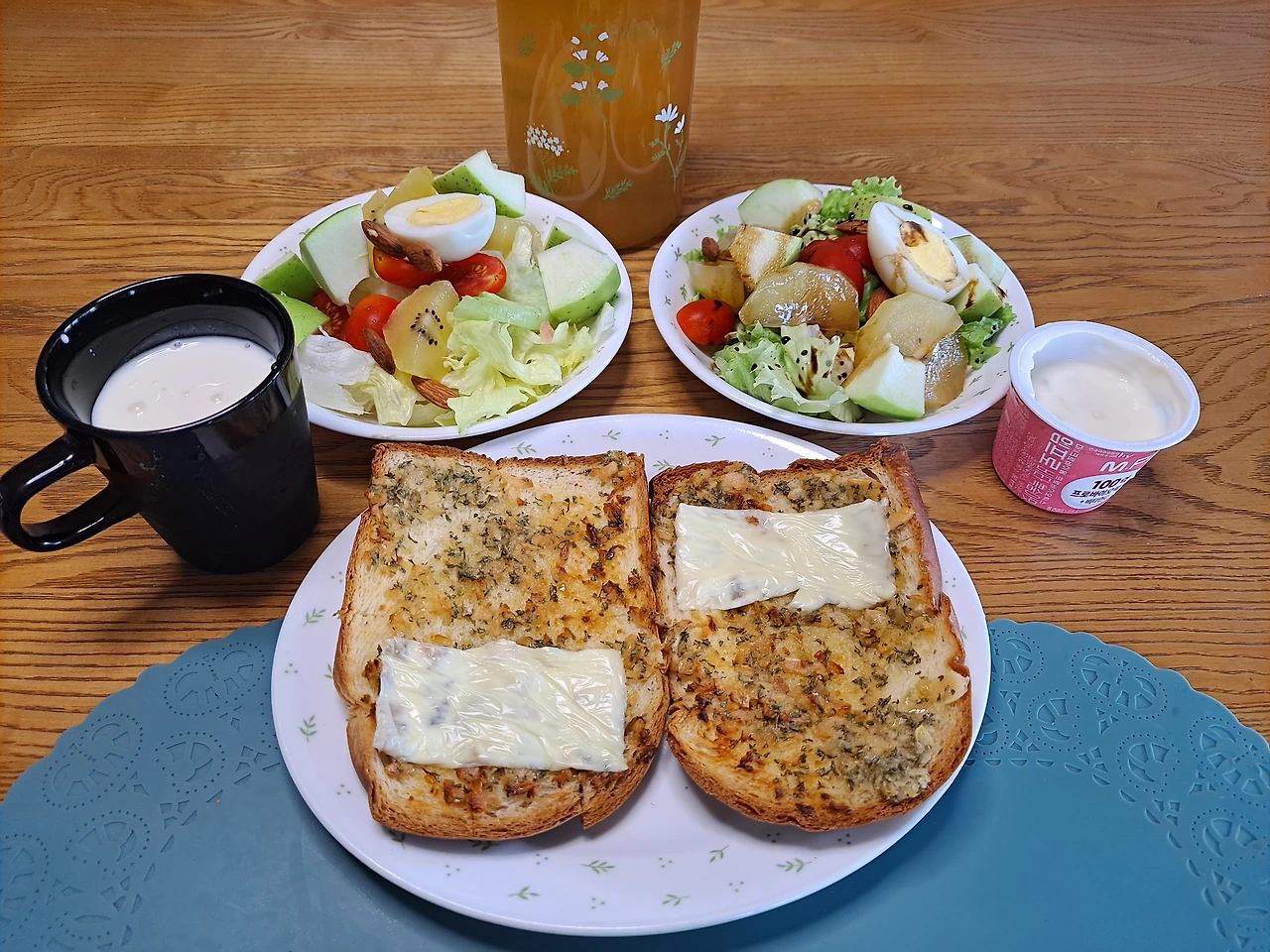 식빵 위에 만든 소스를 골고루 올려주고 에어프라이 160도로 7분을 구운 뒤 그래도 심심할 듯싶어 치즈 한 장을 꺼내 반쪽씩 올리고 치즈가 녹도록 1분 동안 돌려주었어요. 적당히 노릇하니 냄새도 훌륭하고 괜찮다 싶어 어제 막내시누이가 준 요구르트와 요플레로 아침상을 차려냈더니 토스트가 그래도 달다 하네요. 앞으로 꿀은 반스푼만 넣기로 했어요. 당뇨가 없는 분들은 1 스푼이 맞아요. 제 입맛에는 좋거든요. 오랜만에 먹은 달달한 요플래와 향긋한 마늘냄새가 어우러지고 바삭한 식감이 주는 고소함에 만족스러운 아침식사로 행복 한 스푼 담아보았습니다. 오늘도 맛있는 하루 보내세요.