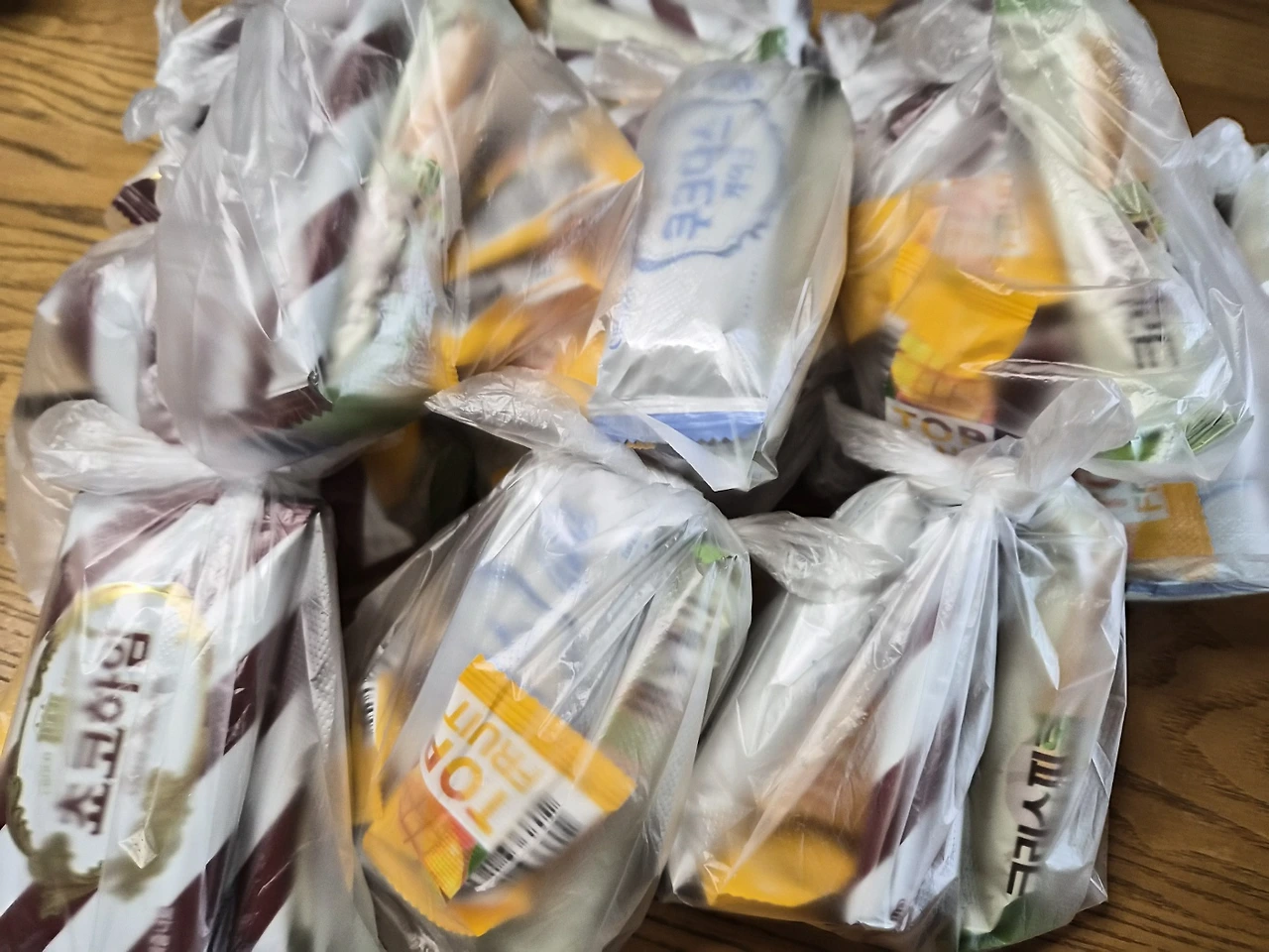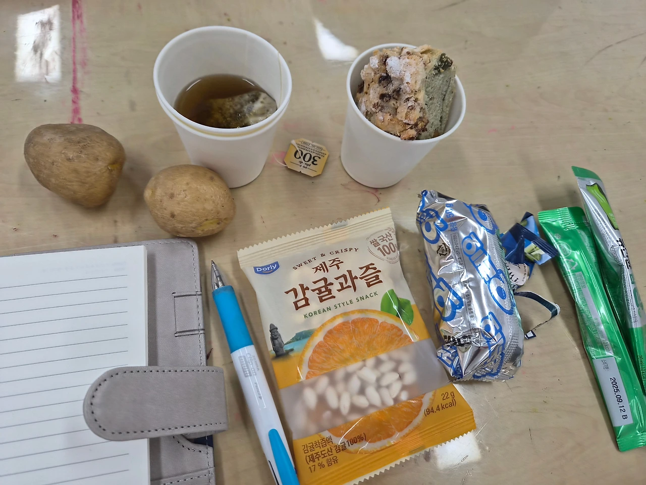 덕분에 조금 일찍 도착하여 조심스럽게 강의실로 들어서니 이미 몇 분이나 와계셨다. 뒤이어 강사님이 들어오시는데 옴마야! 완전 로또를 맞았다. 젊음이 넘치는 긴 생머리에 청포도처럼 연둣빛이 감도는 선생님. 게다가 맨 앞 책상 위에 쌓여가는 먹거리에 글쓰기를 배우겠다는 그 다짐은 어디 가고 잿밥에 더 눈길이 갔다. 궂은 날씨에 딱 어울리는 부추전에 삶은 감자, 유산균까지 푸짐하다 했는데 그다음 주에는 손수 만든 빵까지 아무래도 소원하던 몸무게를 달성하게 되는 것은 시간문제일 것 같다.