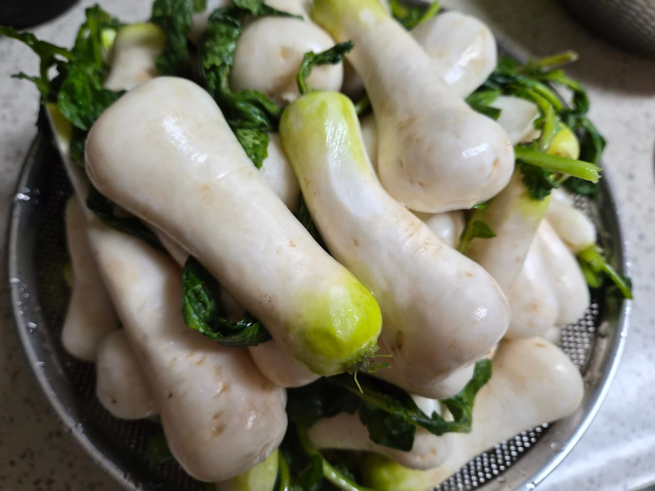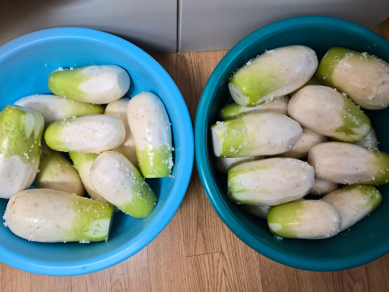 주문한 절임 배추는 금요일에 오는데 그때까지 물러버리게 둘 수는 없다. 다음날 무와 총각무 3단을 또 사 왔다. 섞박지 1통과 총각김치 1통을 담갔다.