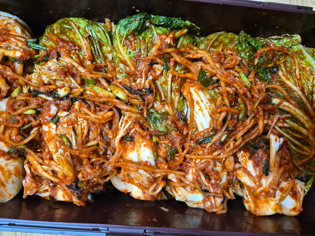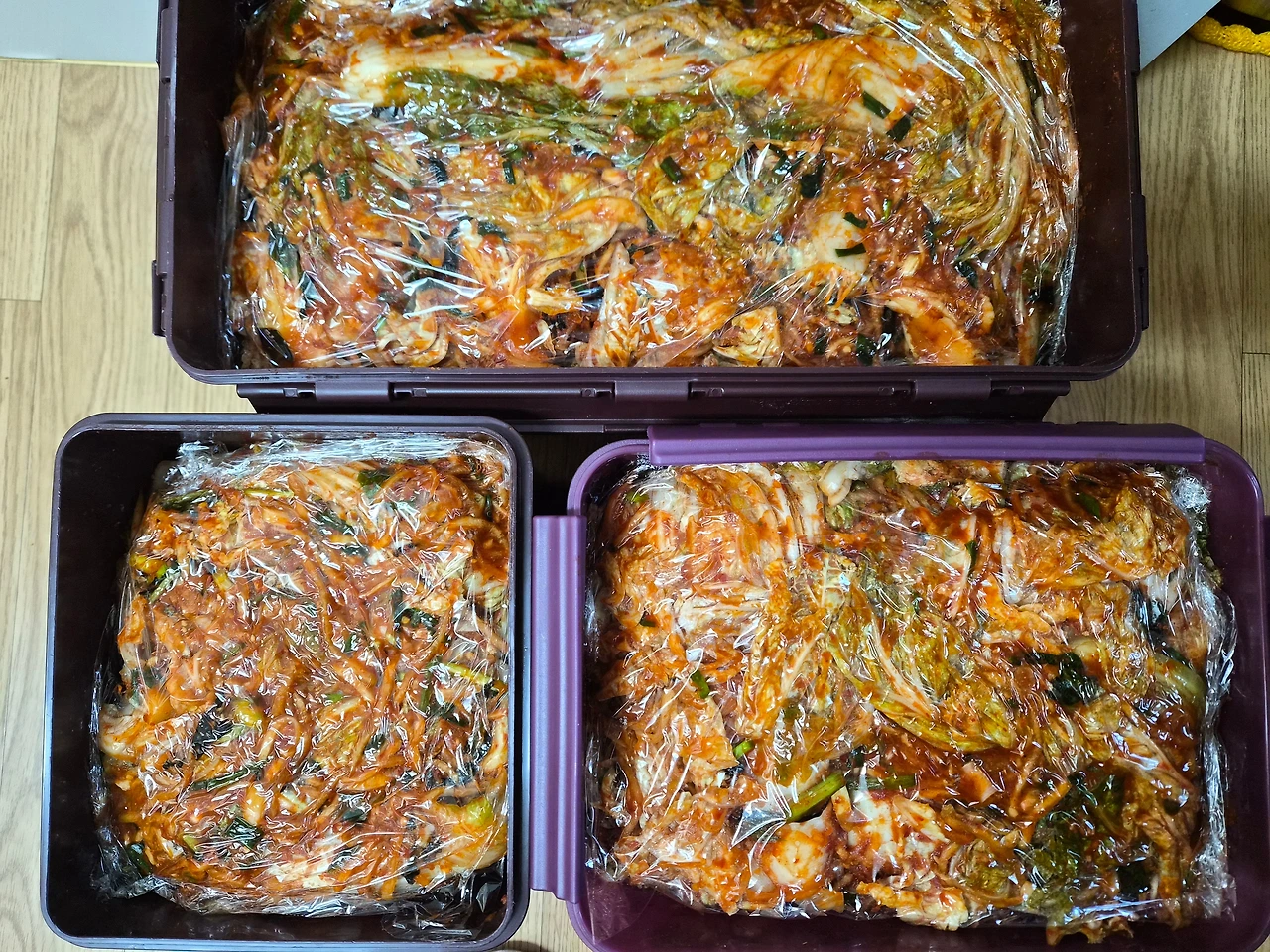 드디어 미리 주문했던 절임 배추 20킬로가 도착했다. 작년처럼 40킬로를 하려고 했지만, 옆에서 거들어 주는 것도 힘들었는지 극구 반대했다. 할 수 없이 양보하여 20킬로를 주문하는 대신에 9포기를 미리 사다 담근 것이다. 배송된 배추를 헹구어 물을 뺀 뒤 정성껏 속을 채웠다. 드디어 2025년 김장인지 김치인지 끝.