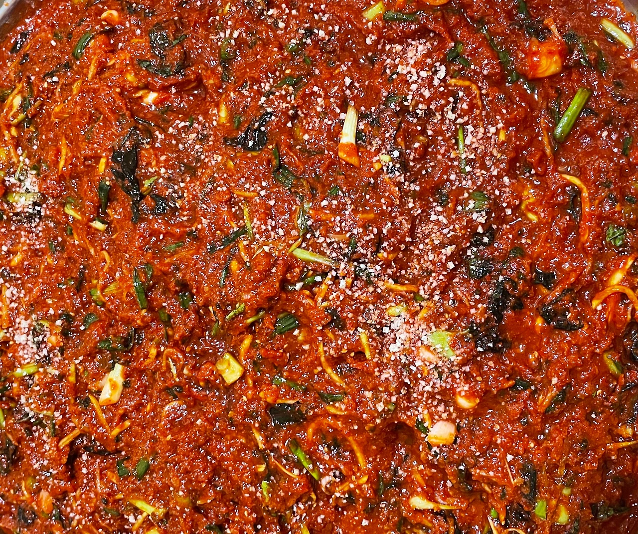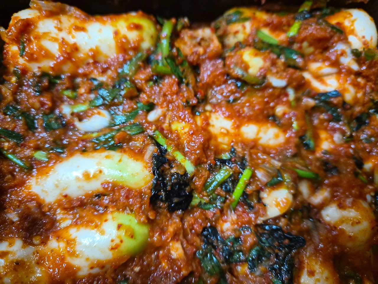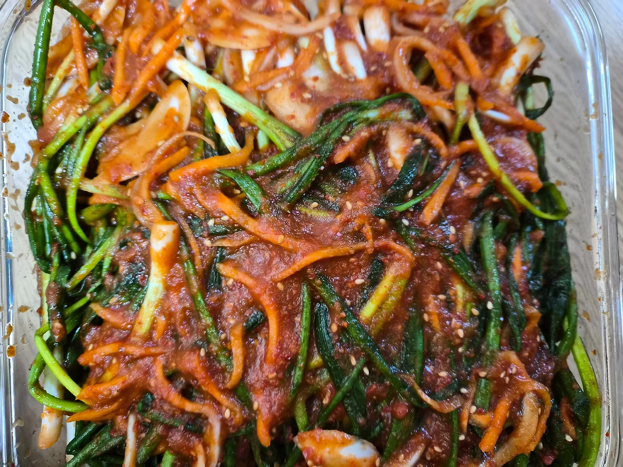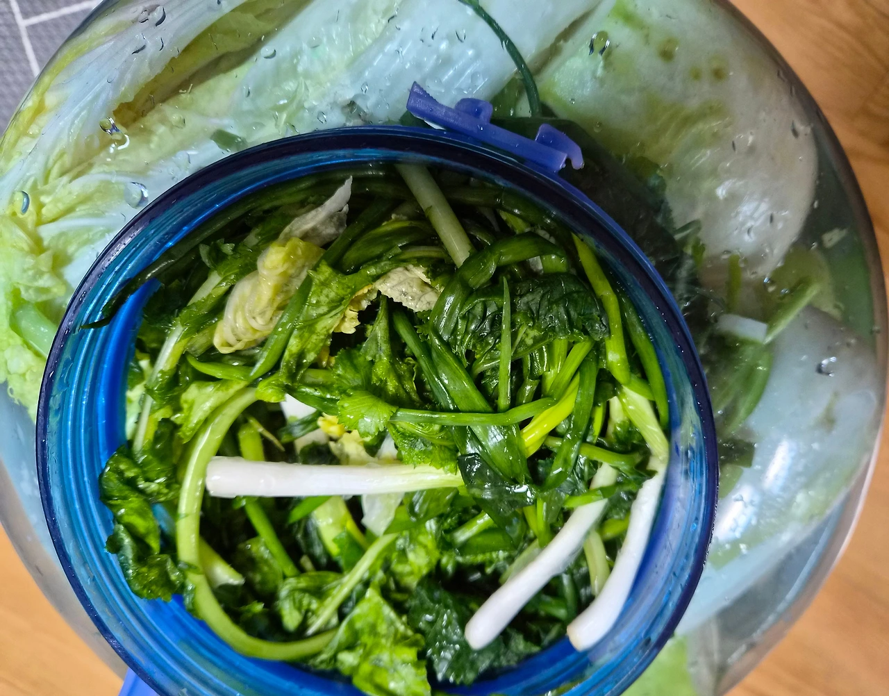 예전에 3~40포기씩 하던 거에 비하면 일도 아니다. 일어나자마자 절인 배추를 씻어서 물을 빼며 여유 있게 김치 속 재료를 버무려 순식간에 해치웠다. 이것으로 끝나야 하는데 또 아까운 파, 갓등 김치 속 재료가 남았다.