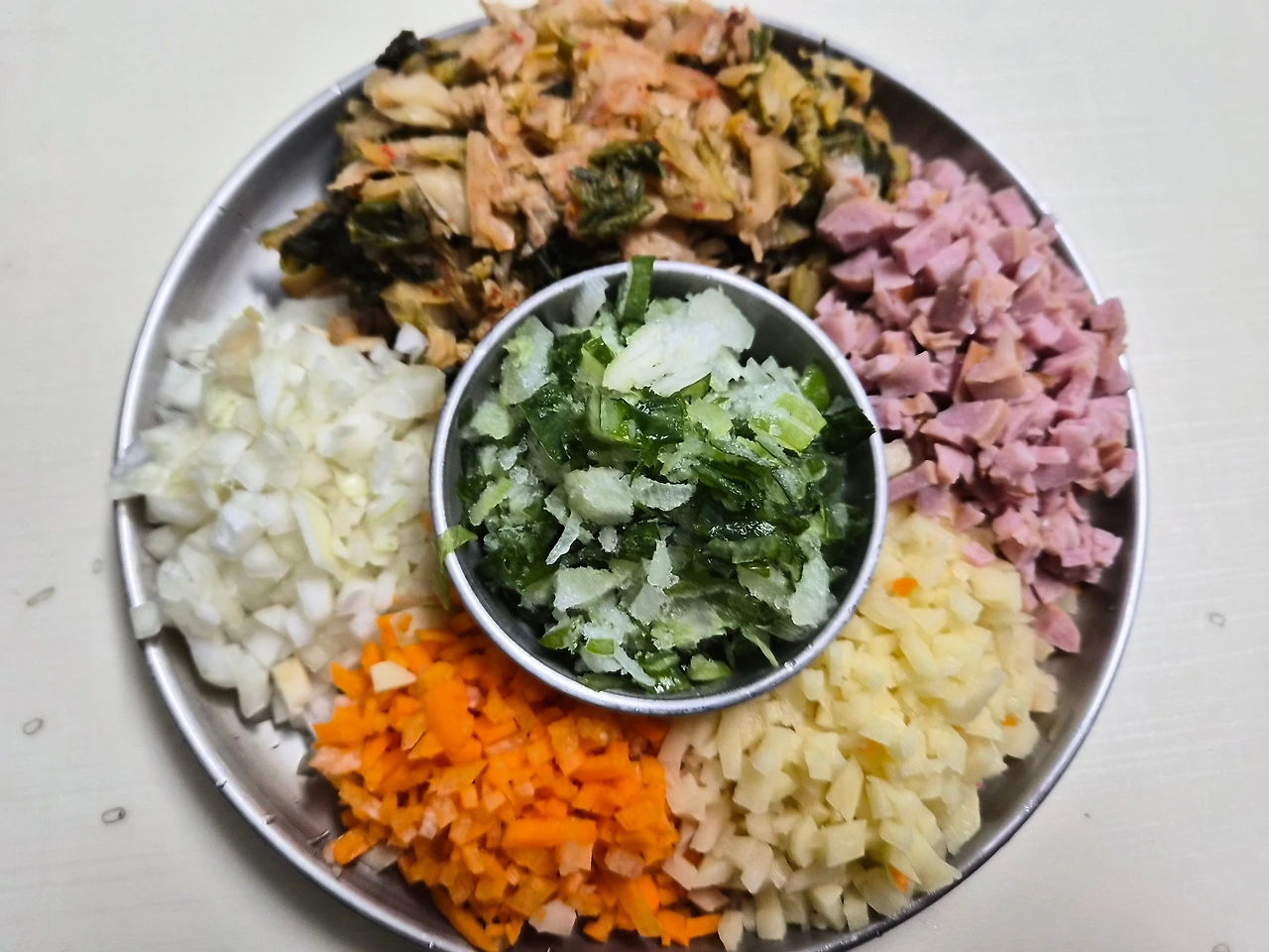 다진 김장김치 크게 2 주먹, 양파 반 개, 당근 반 개, 감자 2개, 소시지 2개, 대파 1줌, 들기름 1 수저, 참치액젓 1 수저. 소금. 후추, 식용유.(야채는 냉장고에 있는 재료 활용하기)