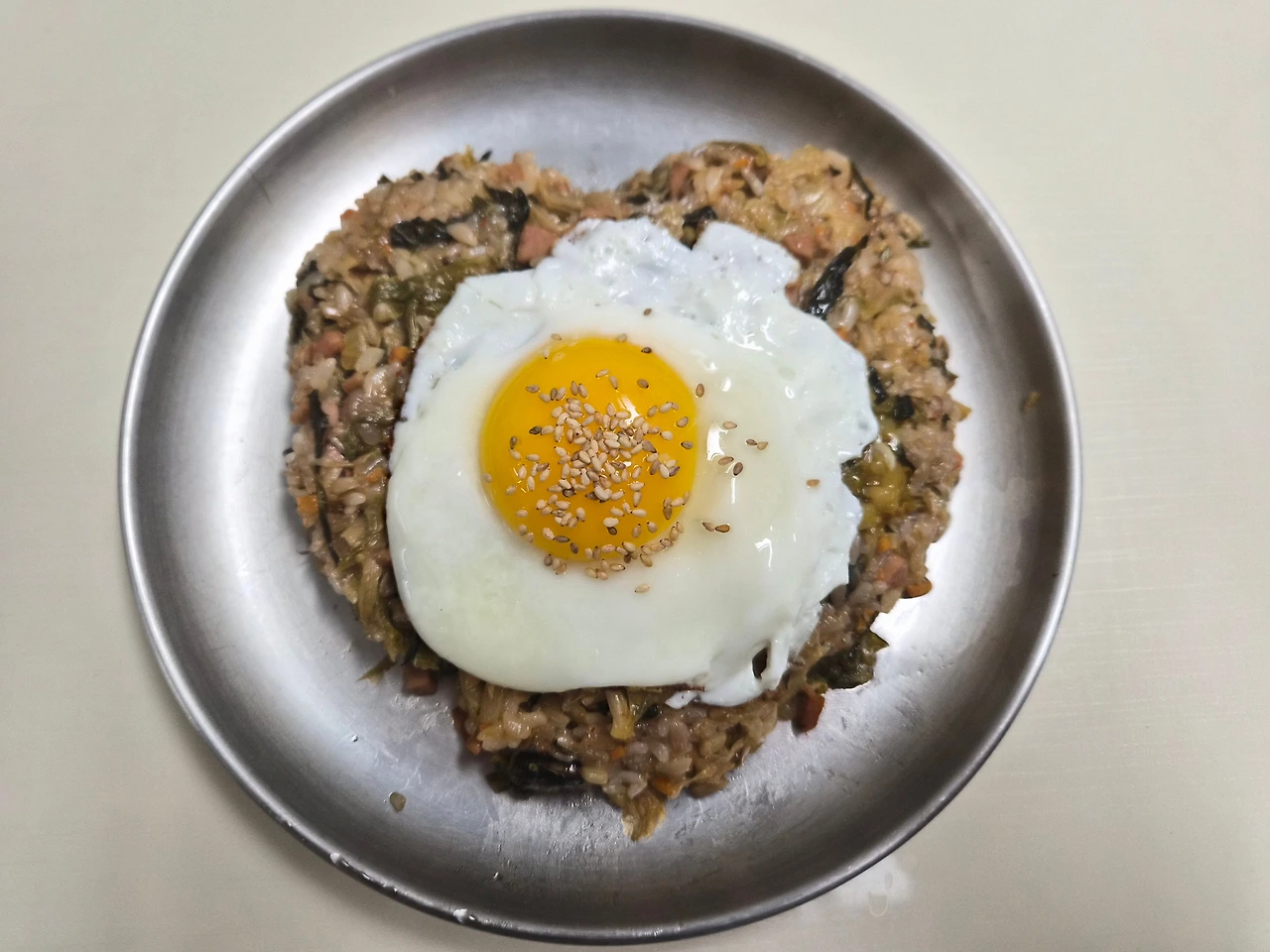 5. 훈이는 비주얼을 중요시하기에 밥으로 하트모양을 만들고 팬에 식용유를 넉넉히 두른 후 계란후라이를 해서 얹었다. 그 위에 통깨도 솔솔 끝.