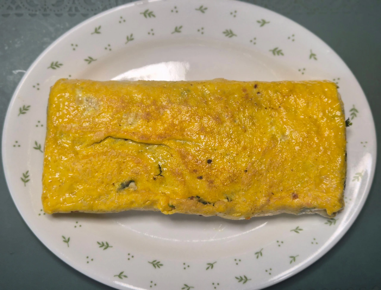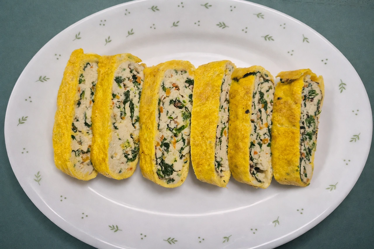 4. 팬에 식용유를 두르고 채소와 두부를 섞은 재료를 팬에 골고루 펴주었다. 약불에 천천히 익히면서 신중하게 말아주는데도 난이도가 최상이다. 말리기는커녕 뭉개지고 난리가 났다. 그래도 주부 경력 40년, 내 사전에 실패는 있어도 포기는 없다. 다음에는 감자전분을 넣어볼까. 여하튼 겉면을 살짝 태웠지만 노른자가 남아 있으니 당황하지 않는다. 어렵게 말아놓은 두부말이는 남은 달걀노른자를 팬에 부어 감쪽같이 숨길 수 있었다.(또다시 해본 결과 두부 양을 3분의 1 정도를 줄였더니 말기가 훨씬 수월했음)