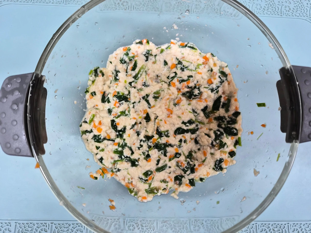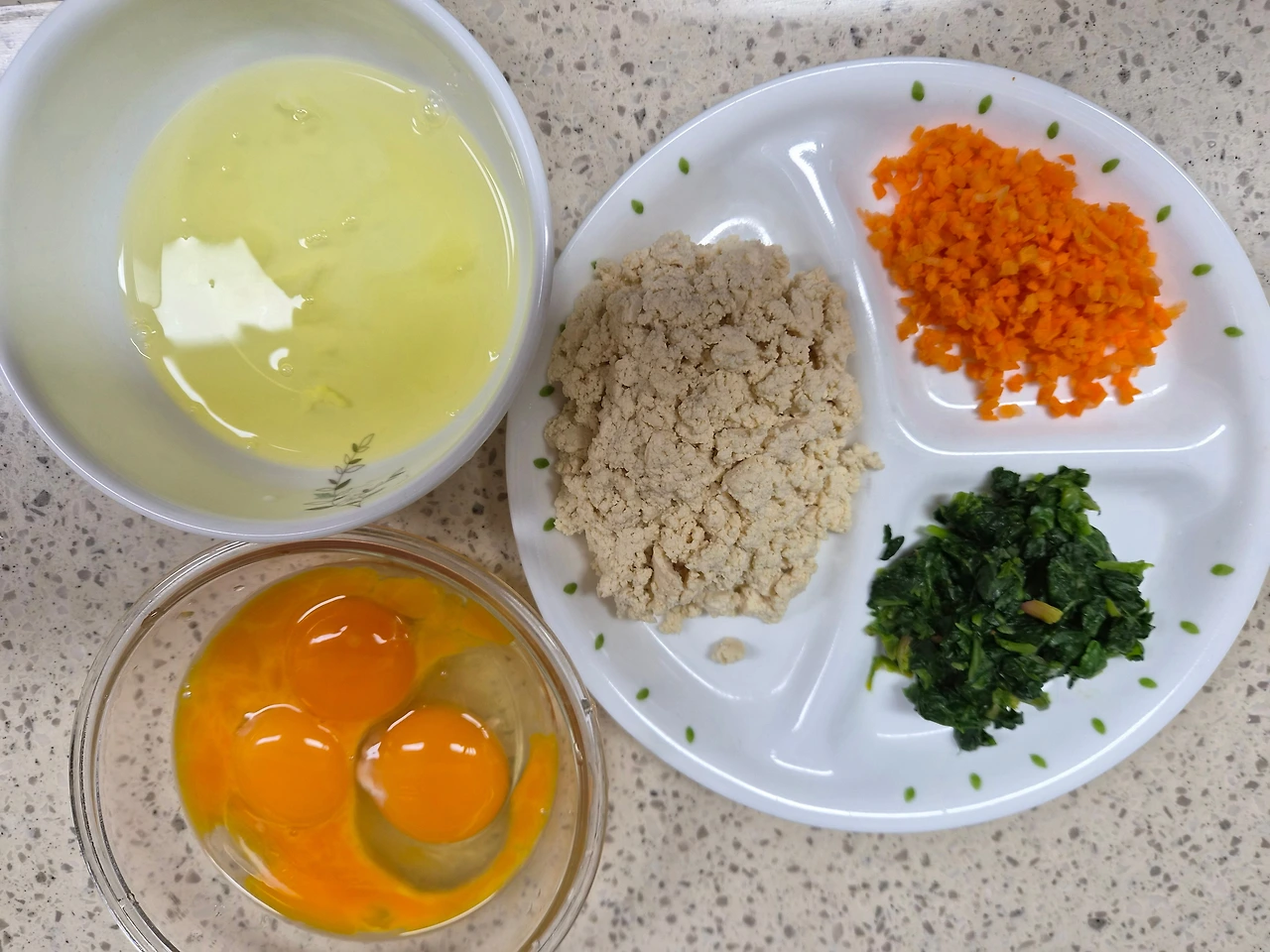 3. 두부는 물기가 없도록 꼭 짜서 볼에 담고, 다진 당근과 시금치, 달걀흰자를 모두 섞어준다. 여기에 맛술 1수저, 참치액젓 반 수저와 소금 2꼬집을 더하여 간을 맞춰주었다. 노른자도 참치액젓 반 수저로 간을 했다.