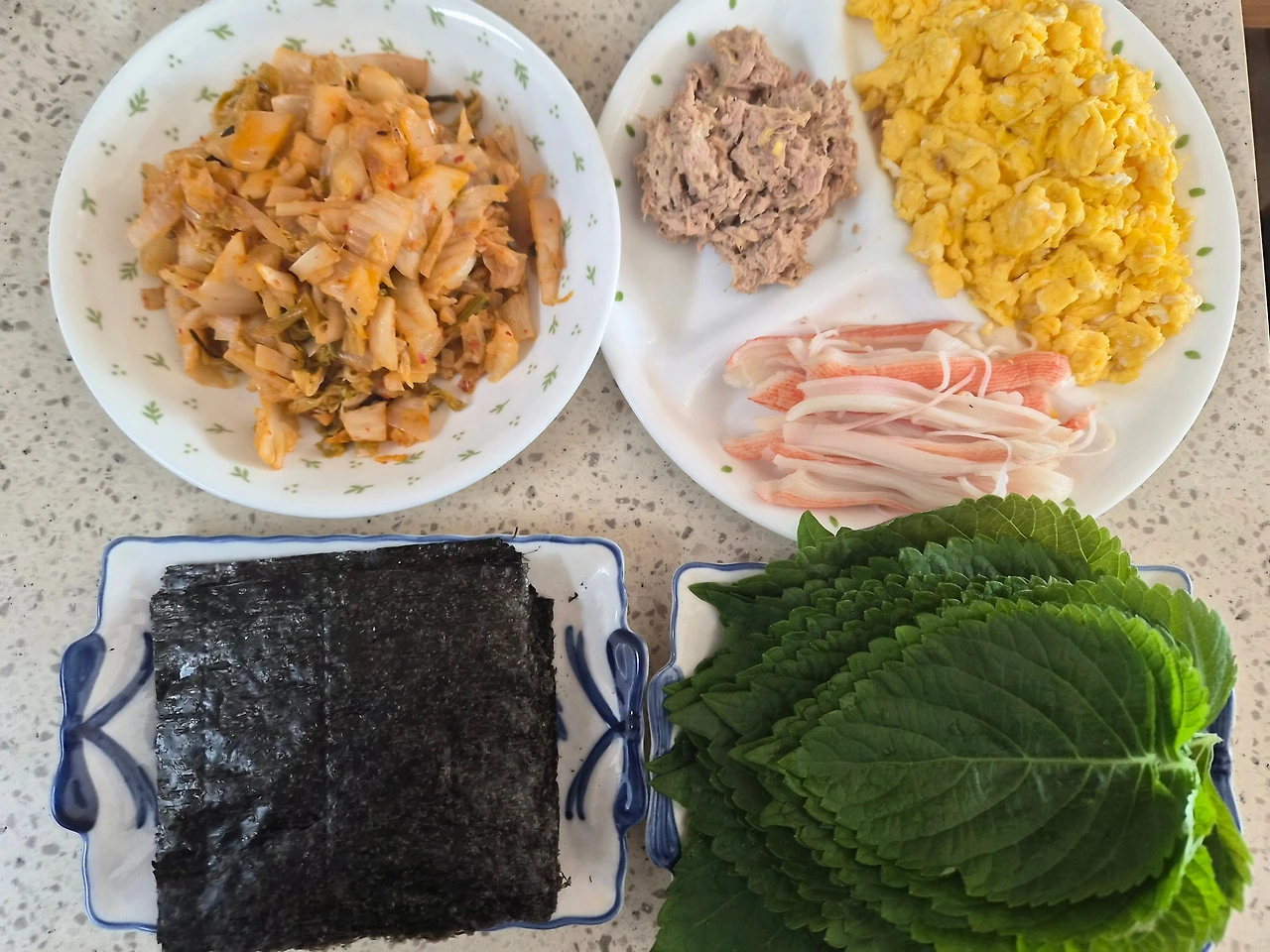 김밥 김 7장, 깻잎 28장, 달걀 3알, 참치 1캔, 크래미 1봉지, 김장김치 1조각, 들기름 1수저, 마요네즈 1수저, 후추, 소금. 깨소금, 식용유.