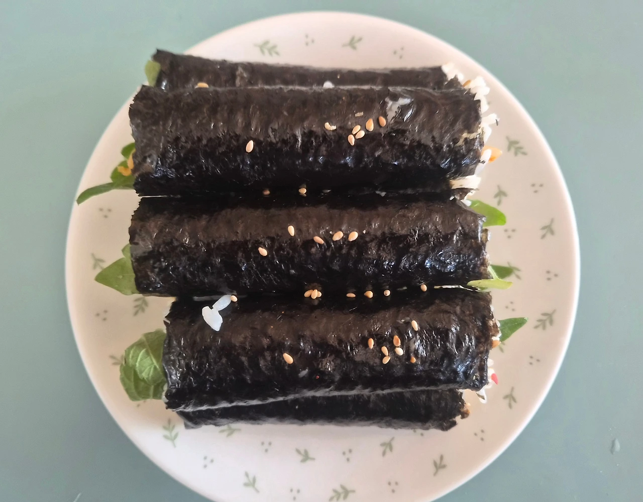 5. 고실고실하게 지은 밥에 소금, 들기름, 통깨를 넣어 비벼주었다. 이어 자른 김에 밥을 깔고 깻잎 올리고 그 위에 참치, 김치, 달걀을 얹어 말아 준다. 말은 깻잎은 밥을 깐 김으로 조심스럽게 또 말아주었다. 이렇게 힘든걸 왜 한다고 했을까. 후회막급이다. 김밥 김 보관에 문제가 있었다. 김을 반듯하게 보관해야 했는데 냉동실에서 이리저리 치이다 부서지고, 엉망이었다. 김이 작아서 더딘 것도 모자라 김밥을 말을 때마다 옆구리가 터져 깻잎이 드러나고 한숨이 저절로 나왔다.