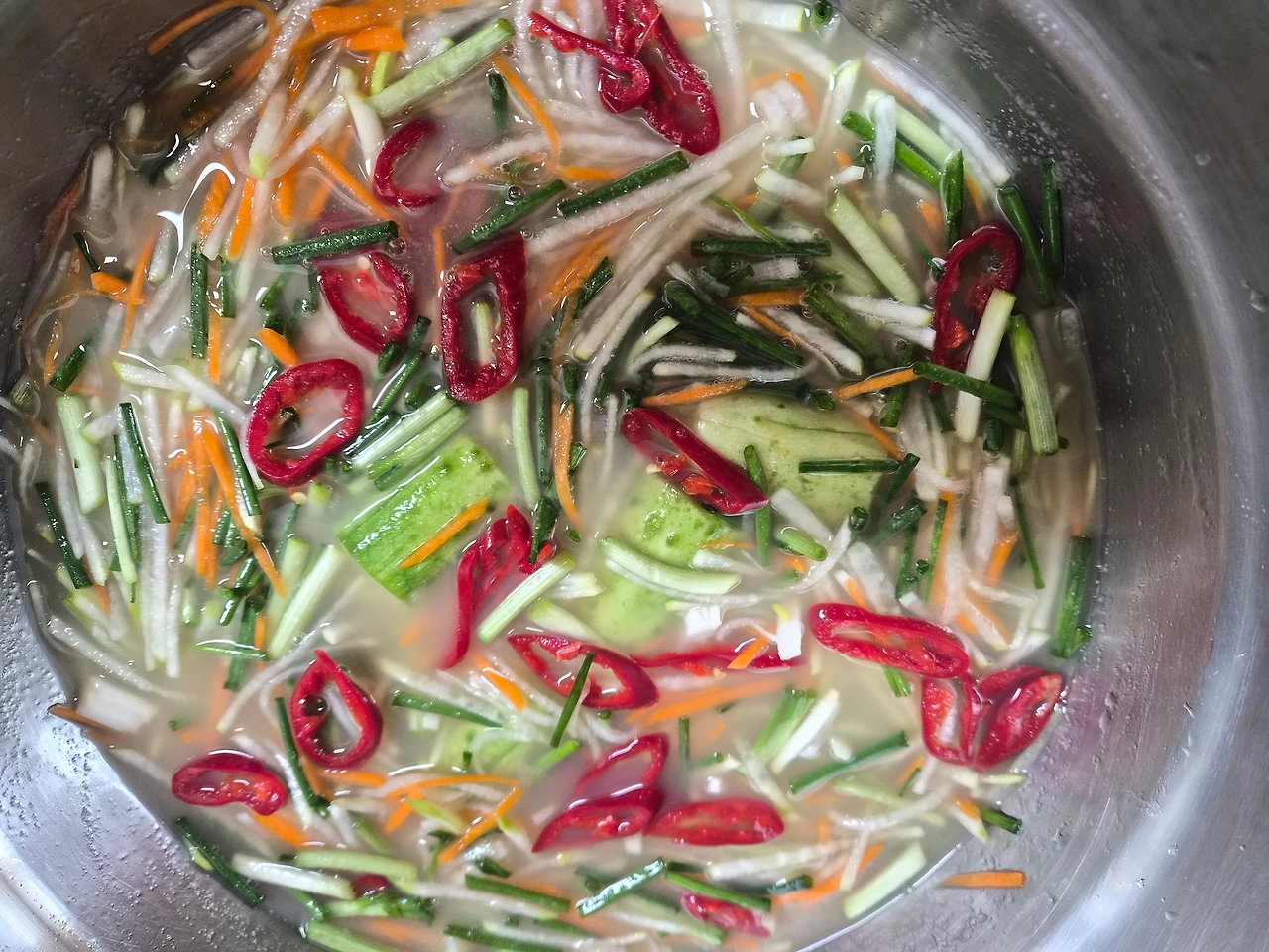 5. 당근과 무는 오래 두고 먹을 것이 아니라 곱게 채 썰었다. 적당히 자른 양파, 생강, 마늘과 배즙, 사과즙도 믹서기에 같이 넣어 갈아서 고운체에 걸러 주었다. 걸러 주면, 국물이 깔끔해진다. 뒤늦게 냉동실에 있던 홍고추 2개를 꺼내 어슷 썰어 씨를 빼고 새빨간 고명으로 준비했다.