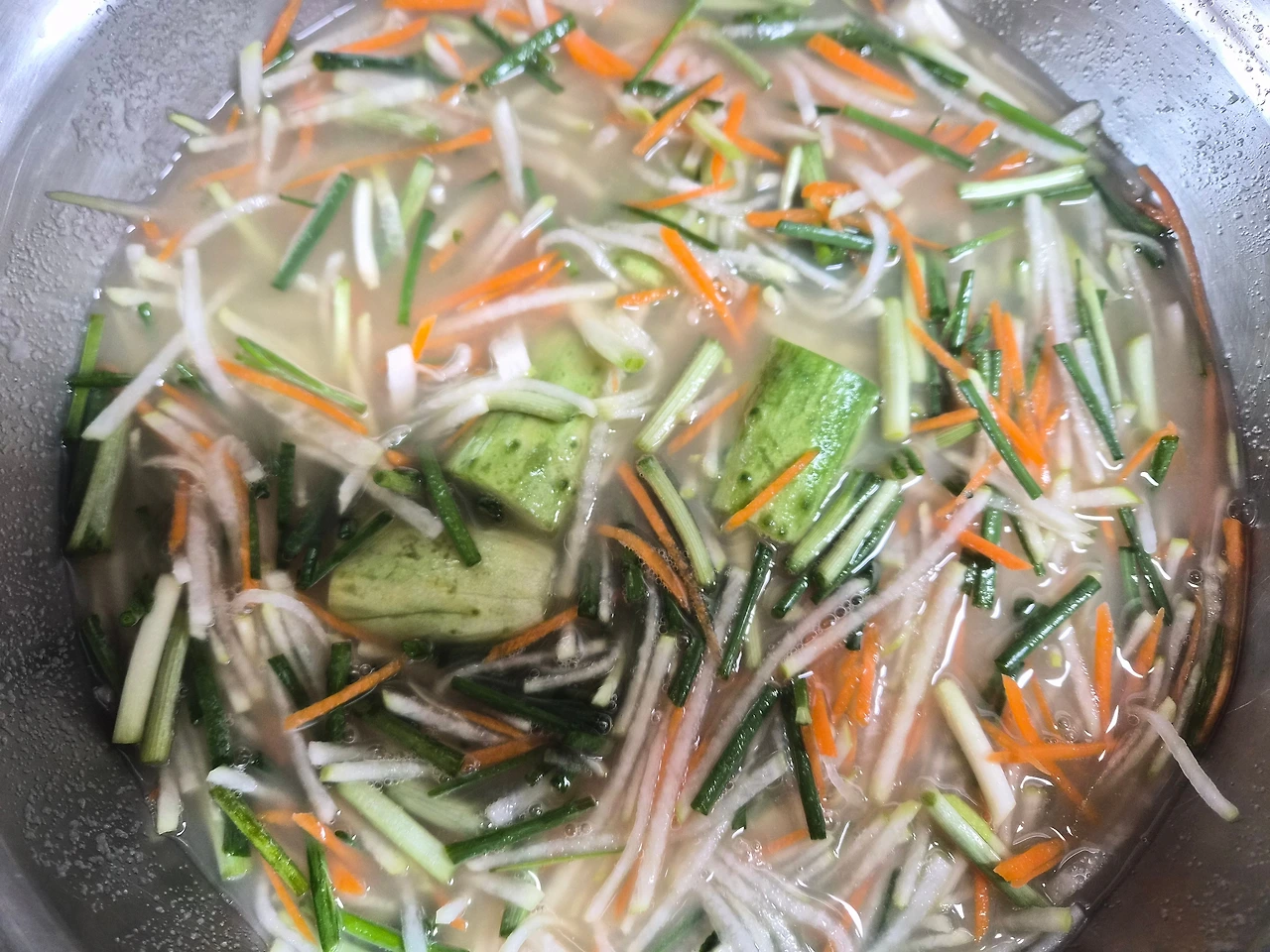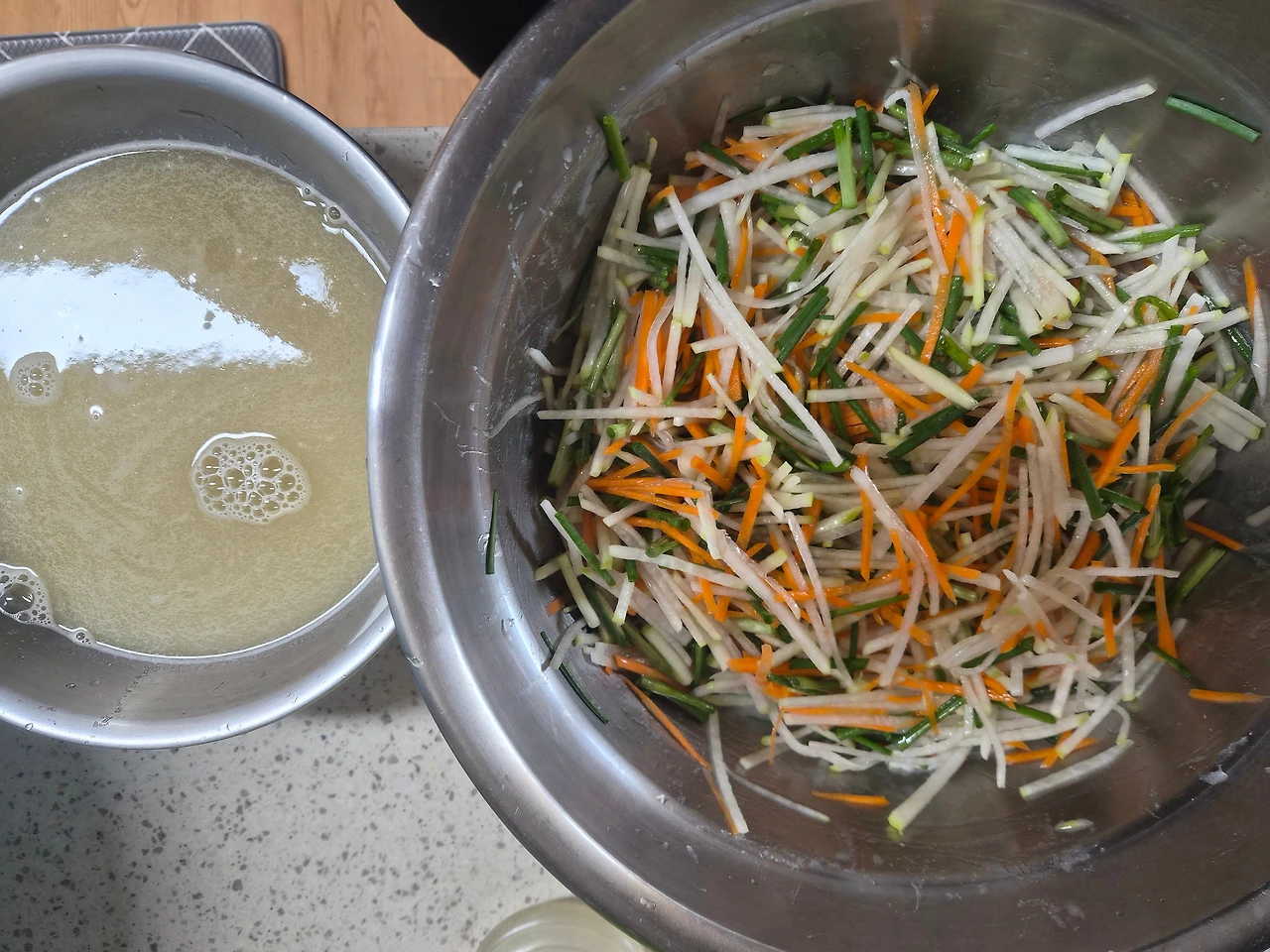 4. 냉장고에 남아 있던 오이 1개도 열십자로 잘라 소금에 절이고, 쪽파 한 주먹도 2센티 길이로 잘라주었다(오이는 없으면 안 넣어도 되지만, 익었을 때 바로 먹으면 그 상큼함이 배가 되니 2개 더 사다 넣음).