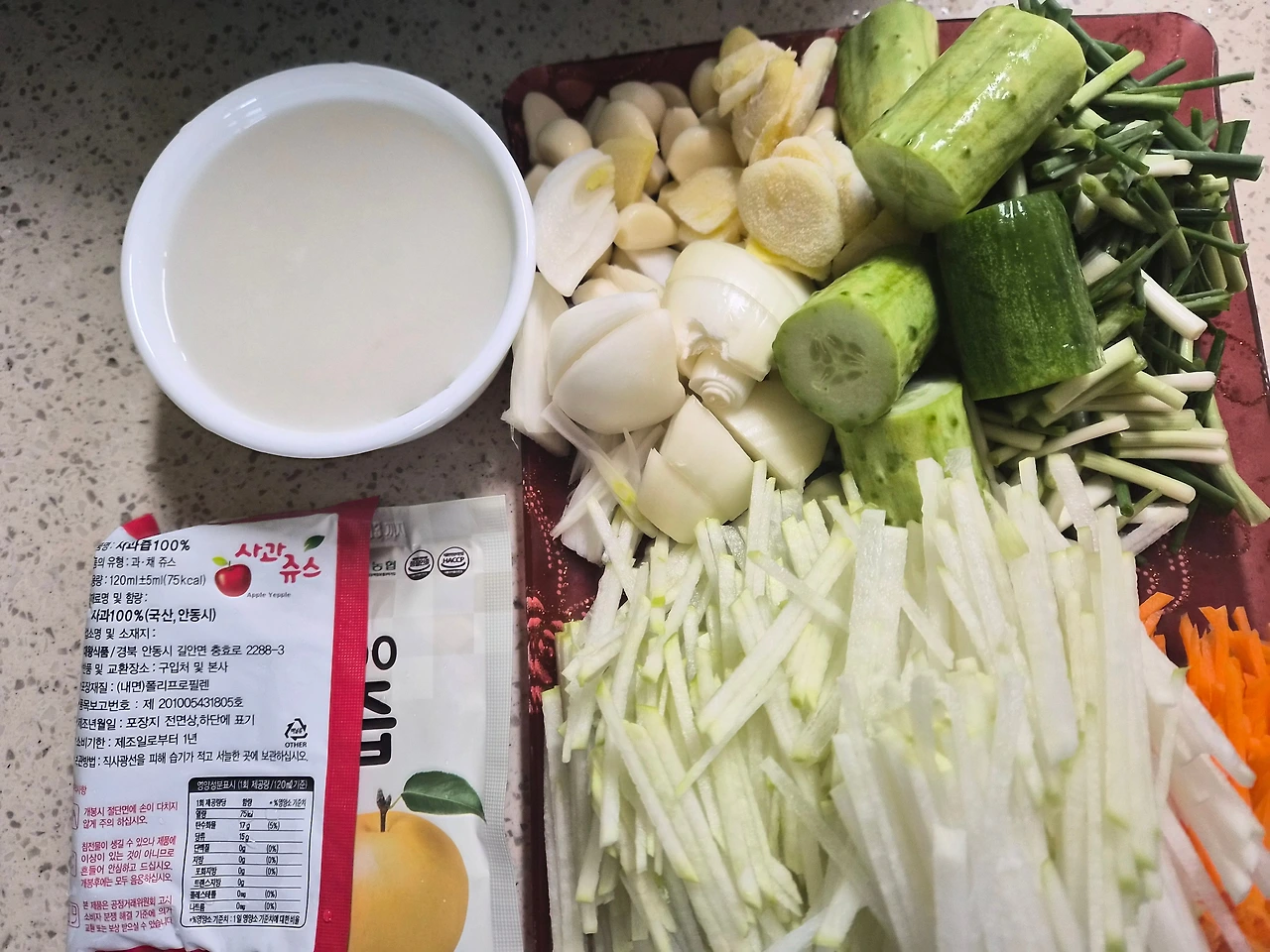 알배기 배추 5포기, 중간 크기 무 1개, 작은 당근 1개, 오이 1개, 쪽파 1주먹, 양파 1개, 간 마늘 3수저, 생강 1수저, 홍고추 1개, 찹쌀 풀 1공기, 육수 5컵, 배즙 1봉지, 사과즙 1봉지, 매실청 2수저, 천일염 2컵, 알룰로스 1수저, 멸치액젓 2수저, 구운 소금 2수저 반.