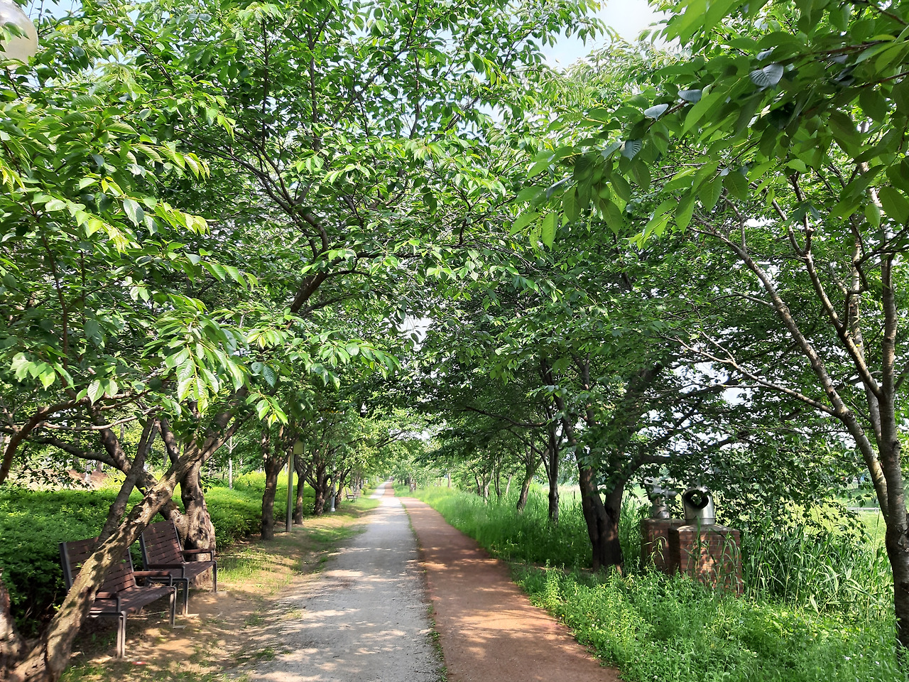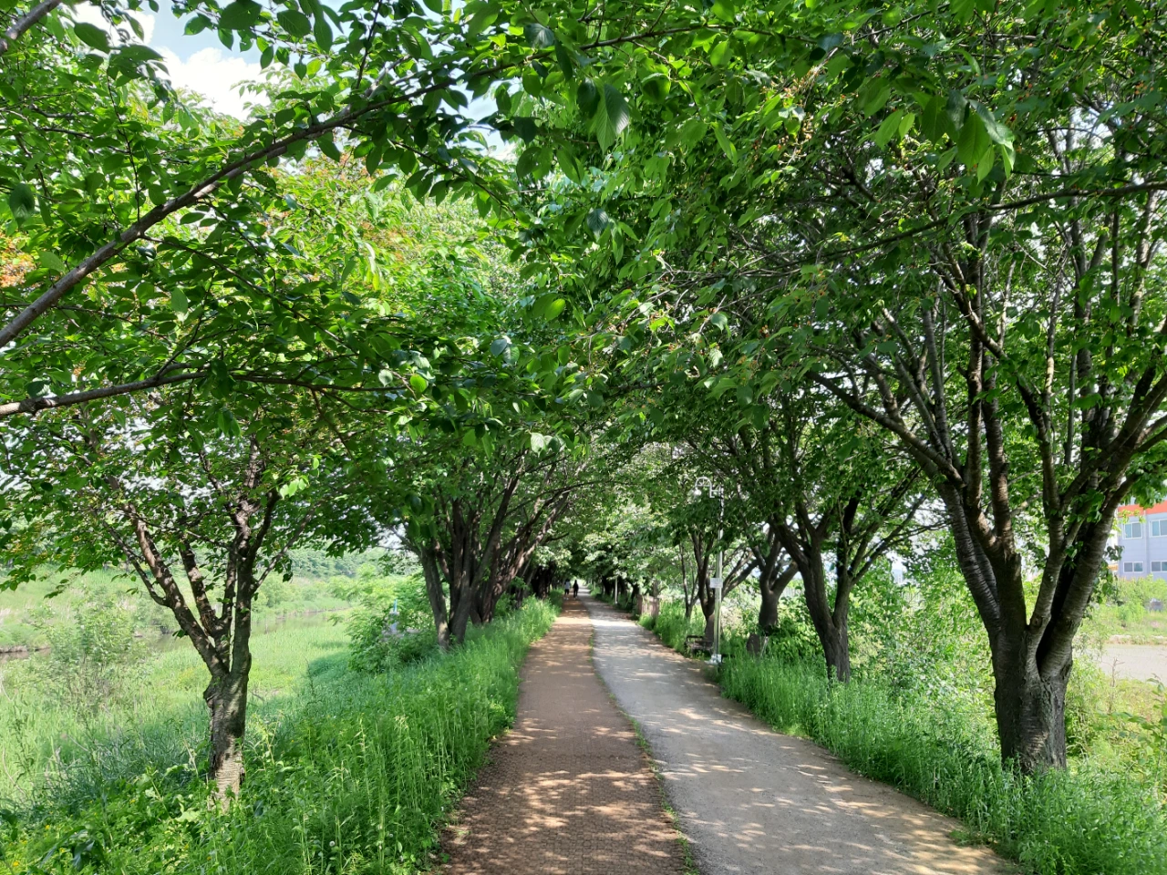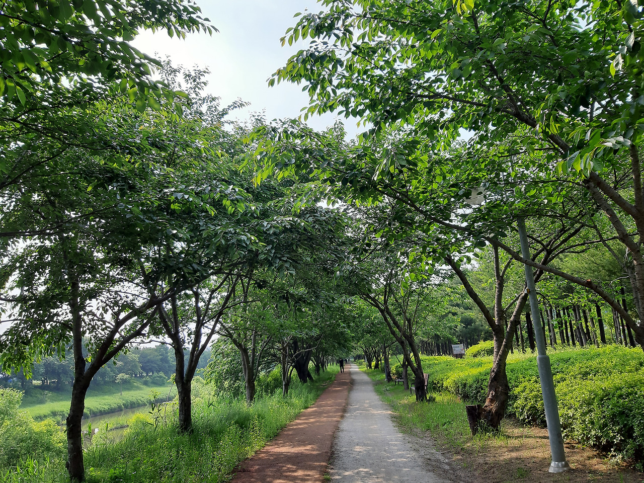 오늘 낮 기온은 27도까지 오른다는 일기예보가 딱 맞았는지 햇빛은 뜨거웠고 조금만 걸어도 땀이 났다. 모처럼 황구지천 둘레길을 찾았다. 별 기대 없이 들어선 길에는 초록빛이 가득한 벚나무가 나를 반겼다. 꽃이 지고 난 5월에 푸르름이 처음엔 낯설었다. 꽃이 떨어지고 한달만에 이렇게 푸른 빛을 낼 수 있었나 할 정도로 잎이 무성한 나무가 되어 있었다. 꽃이 떨어져도 나무는 풍성한 나뭇잎으로 그늘을 만들어 주었다.