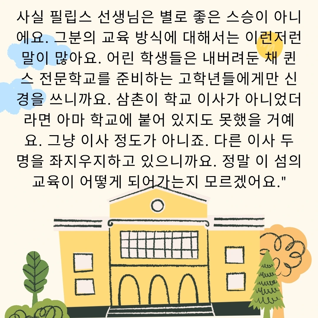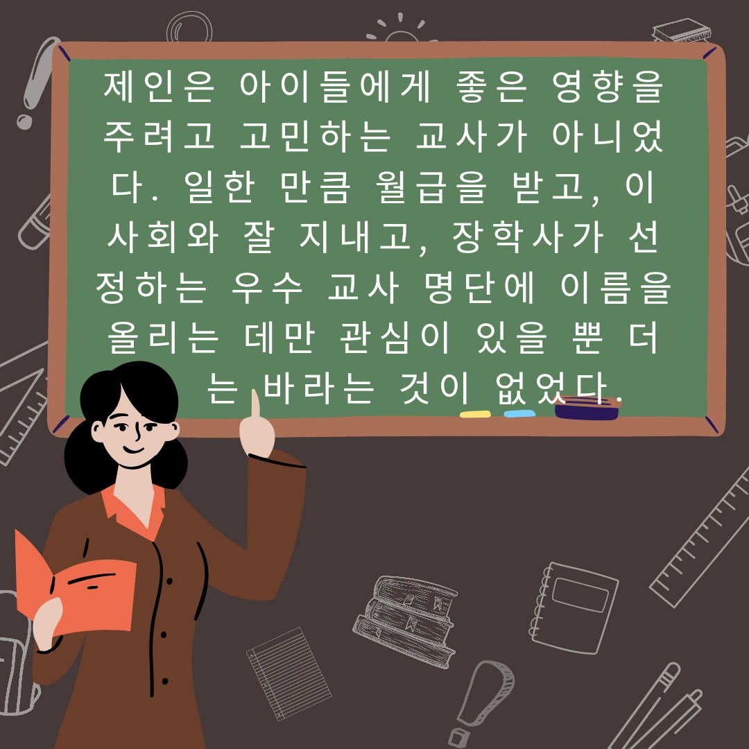 삼촌이 아니면 학교에 붙어 있지도 못했을 필립스 선생님. 다른 이사 두 명을 좌지우지할 만큼 세력이 강한 이사 삼촌의 뒷배를 가진 필립스 선생님. 아이들에게 좋은 영향을 주려고 고민하는 교사가 아니라, 일한 만큼 월급 받고 장학사가 선정하는 우수교사 명단에 오르는 일에만 매달리는 제인 선생님.
