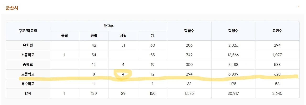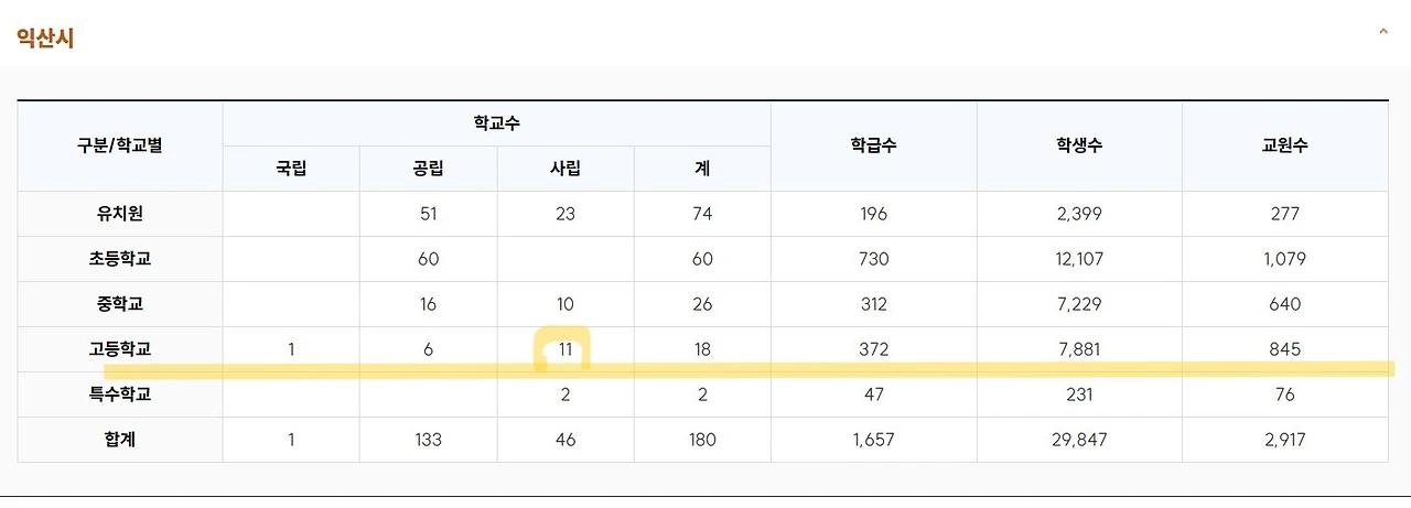 위 통계자료를 본다면 전주와 익산은 사립고등학교 비율이 상당히 크다. 그렇다면 사립교사들의 자질과 실력이 향상되지 않는 한 전북 교육의 미래는 어둡다.
