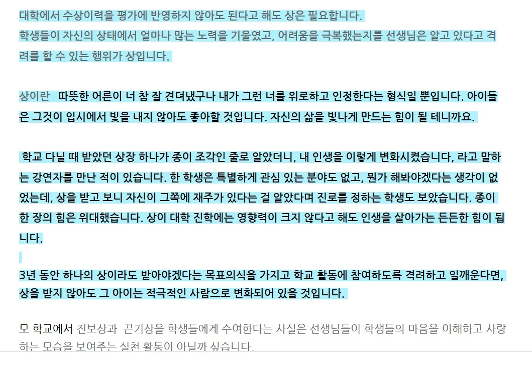 수상경력이 대학 진학에 반영되지 않는 것은 교장선생님의 말이 맞다. 하지만 넓게 보면 꼭 그런 것은 아니다. 상을 받기까지 학생의 노력, 참여활동 과정, 협력 정도, 깨달은 사실 등등은 창체활동에 얼마든지 기록될 수 있다. 담임교사와 학생이 상담하는 동안 학생이 자신의 노력한 과정을 말하고, 이를 토대로 담임교사는 생기부에 여러 항목에 기술할 수 있게 되어 있다. 단 @@대회에서 1등을 했다는 사실을 반영하지 않는다는 것이지, 학생들의 노력과 활동과정, 협력 정도 등등을 기술할 수 없다고 하지는 않았다.