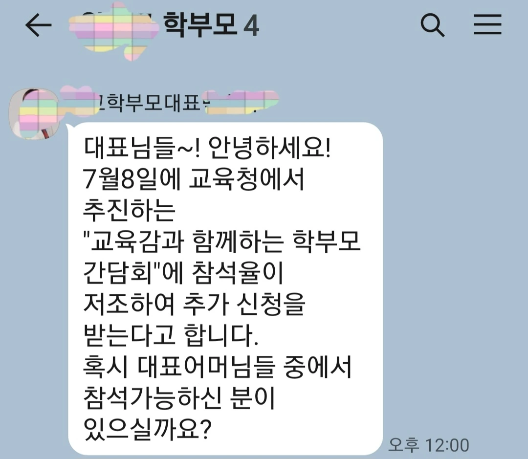 7월에 있는 도교육감님과 하는 공감토크에 학부모 참여가 있었다. 교육청에서도 많은 홍보가 있었고, 학교 홈페이지에도 공지됐다. 큐알코드로 들어가면 학교를 통하지 않아도 누구나 쉽게 신청을 가능했다. 어느 날 학부모 회장으로부터 문자가 왔다. 추가 신청을 받는다는 내용이었다. 학교가 나서서 참여를 독려하지도 않았고 신청도 받지 않았는데 무슨 추가 신청을 받는다는 말인가. 많은 학부모가 참여하길 원한다면 학부모 전체 알림톡을 보내야 마땅하다. 그런데 딱 6명에게만 연락을 하는 하는 이유는 뭘까.