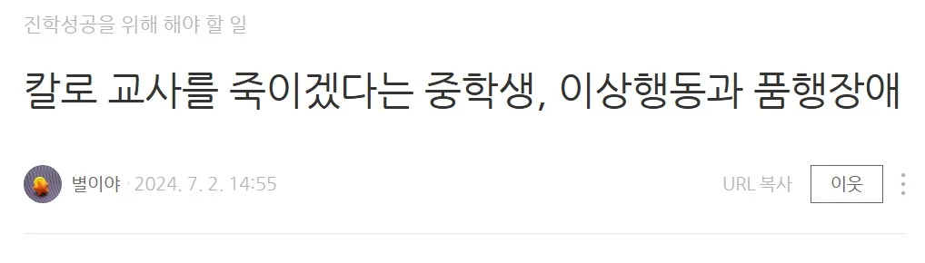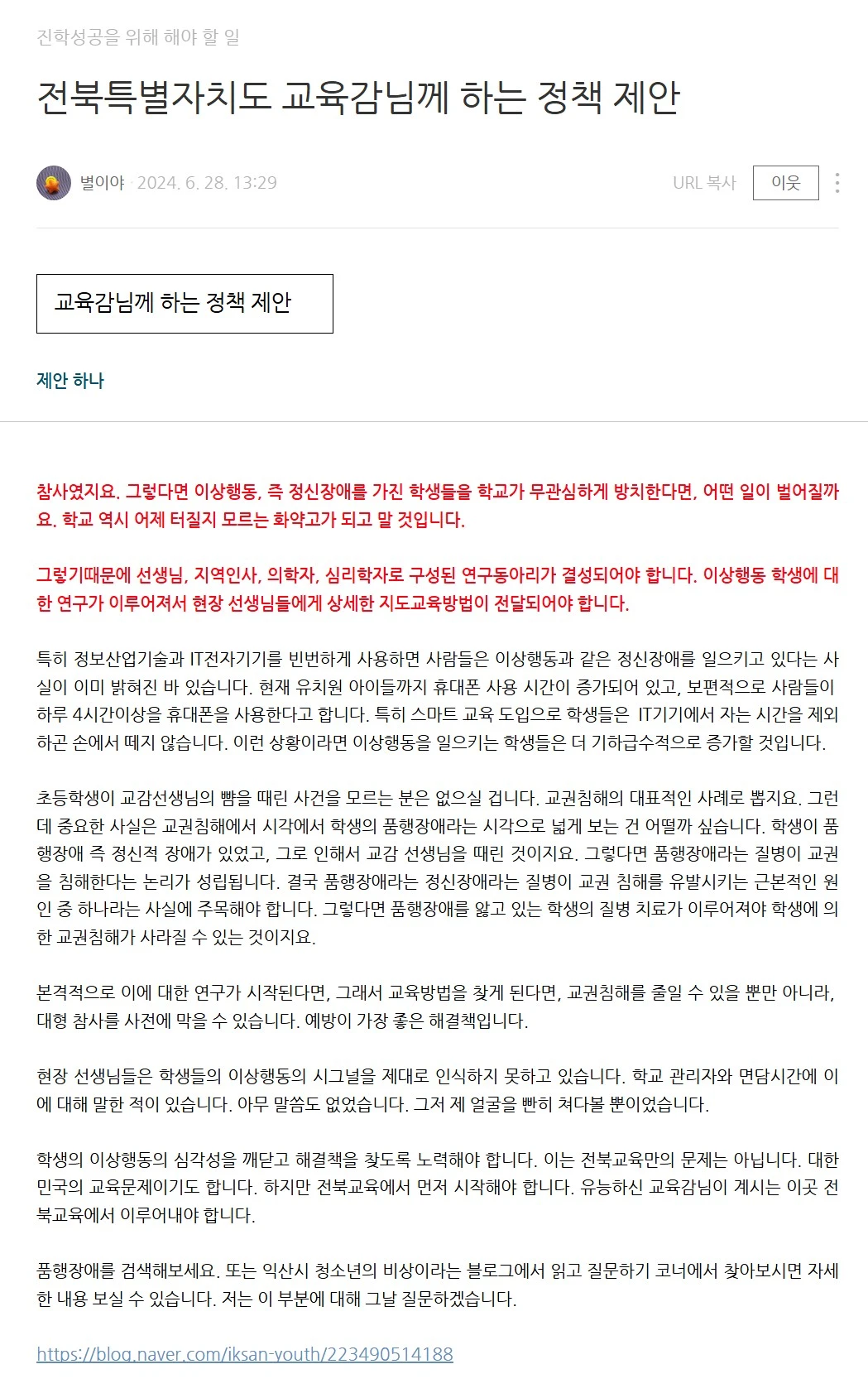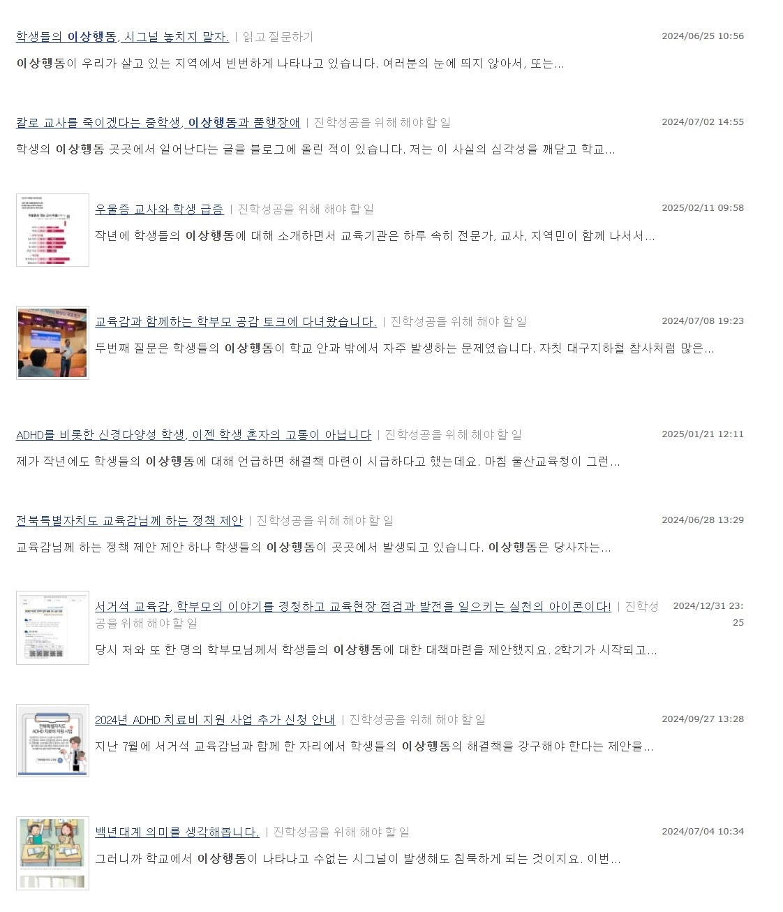 위 사진에서 볼 수 있듯이 학생들의 이상행동에 대해 여러 차례 블로그에 글을 올렸다. 교육부에 주최하는 교육 정책 공모전에도 이상행동의 연구와 대책 교육에 대한 제안을 했다. 수상을 위한 것이 아니라, 교육 관계자가 이에 대한 경각심을 갖고 하루빨리 이에 대한 연구 집단과 대응 체계를 구축하길 바라는 뜻에서 적극적으로 참여했다.