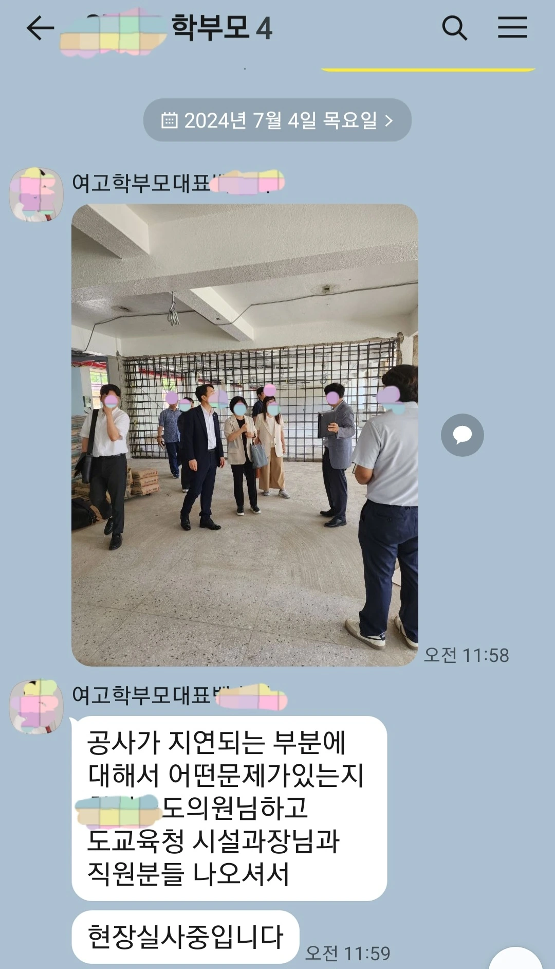 그들이 말하고 싶었던 것은 학생에 대한 배려가 없다는 것이었고, 소음 민원의 발원은 기숙사생과 관련된 것을 알 수 있었다. 그렇다면 기숙사생 학부모들에게 해결 방법을 제시하고 그들의 마음을 움직이게 했어야 하지 않을까. 그런데 학년 대표와 부대표 6명에게 민원을 넣지 말아 달라는 당부의 말이 고작 문제 해결이라니 놀랍지 않은가. 또 두 달 후 어느 날 학부모회장으로부터 문자가 왔다. 사진 한 장과 함께 공사지연 현장실사 중이라는 내용이 담겨 있었다.