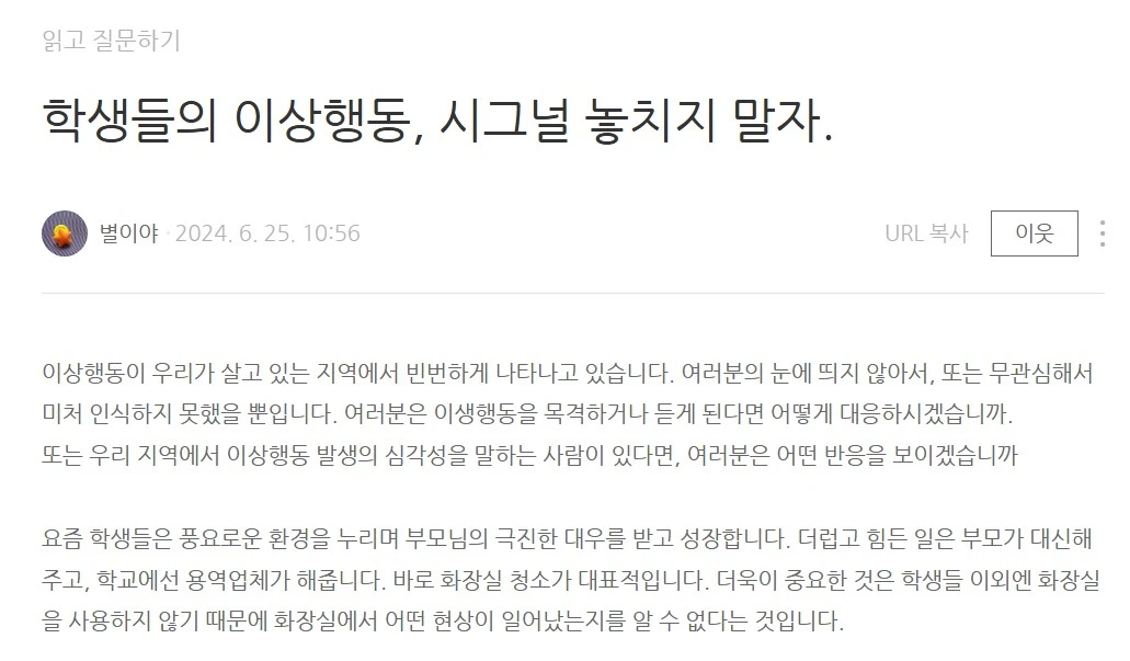 과거와 달리 현재 학생들은 화장실 청소를 하지 않는다. 외부에 용역을 맡겨 청소가 이루어진다. 학교는 용역업체에 일지를 쓰게 하고 있는 것일까. 학생들의 상태를 직접적으로 관찰할 수 있는 공간의 상태를 확인할 수 있는 상황 일지를 작성되어야 한다. 그런 일이 이루어지면 이상행동을 하고 있는 학생들의 심리적인 상황을 진단할 수 있는 자료로 활용될 수 있다.