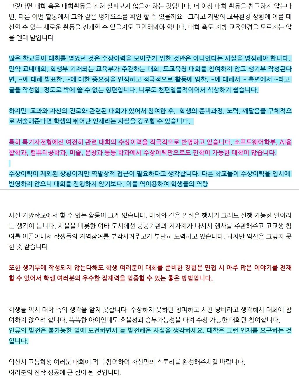 항상 우리는 질문을 해야 한다. 대학이 수상이력을 반영하고자 했던 이유는 무엇일까. 수상이력을 반영하지 않는다면 대학은 어떤 항목을 더욱 많이 평가를 하려고. 할까. 단순한 의문이지만 이런 의문이 대학 진학의 성공률을 높일 수 있다는 점을 명심해야 한다.