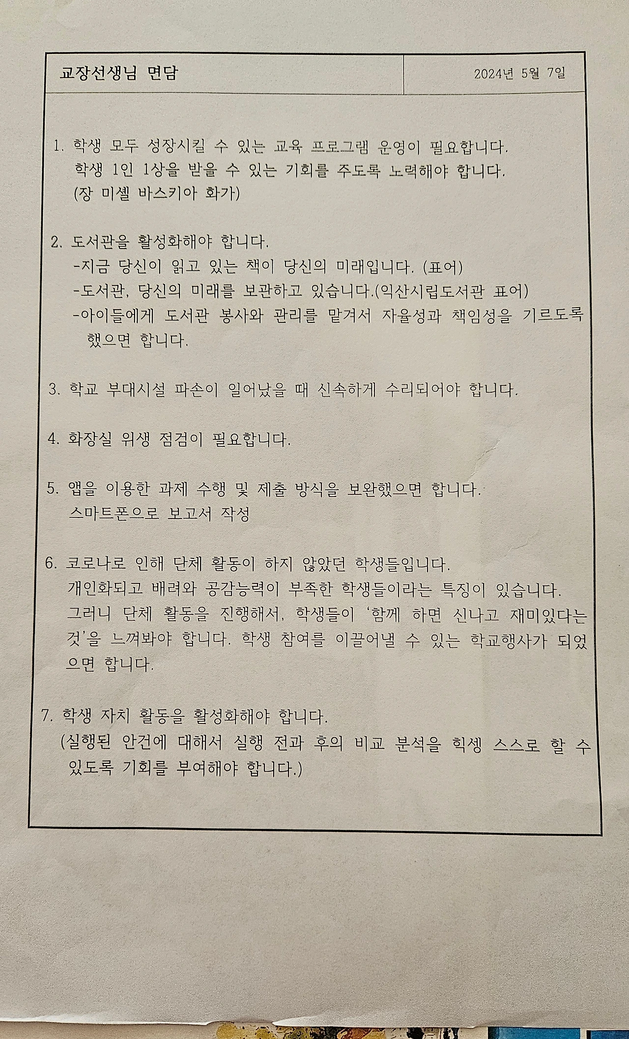 그리고 5월이 되어서 학부모 회장이 교장선생님께서 학부모와 면담을 하고 싶다고 했으며 건의사항도 듣고 싶어 한다고 전화가 왔다. 나는 학부모 회장에게 들은 이야기를 100%로 믿었고, 그동안 학교에서 대해 개선해야 할 점을 느끼고 있었던 터라 하나하나 정리를 하여 A4용지에 적었다. 특히 입시 진학 분야에서 일을 한 만큼 개선되어야 할 부분이 눈에 띄었고, 어찌할 방법이 없어 안타까워하던 중이었는데 잘 되었다는 생각이 들었다.